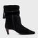 Bota de cano médio em couro suede. Possui salto estilo kitten heel, bico fino e tira com barbicachos que envolve o modelo. Fechamento em zíper lateral.