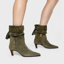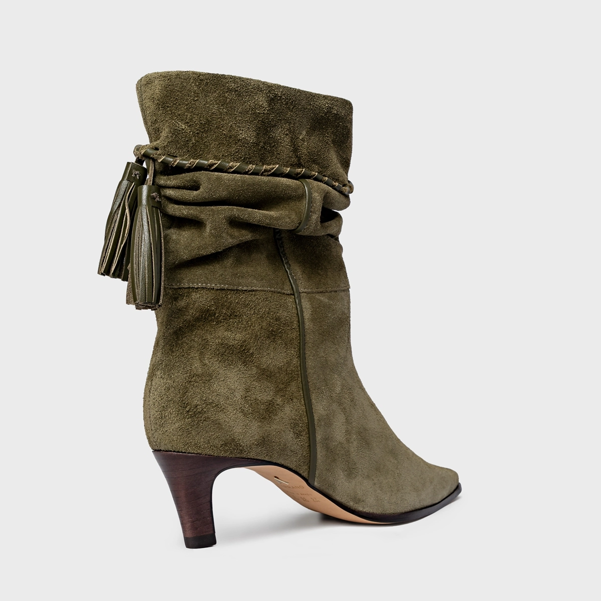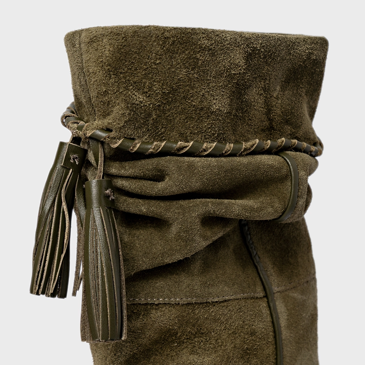 Bota Slouchy Franjas Salto Fino Couro Suede Verde Army Green