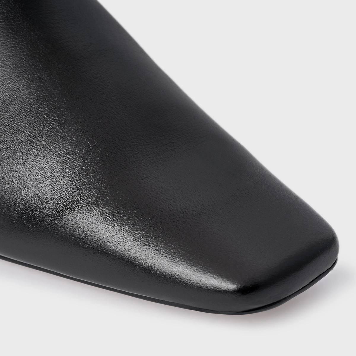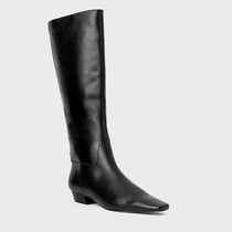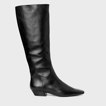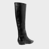 Bota de cano alto em couro. Possui salto bloco, bico fino alongado e zíper lateral para facilitar o calce.