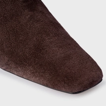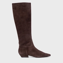 Bota de cano alto em couro suede. Possui salto bloco, bico fino alongado e zíper lateral para facilitar o calce.
