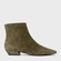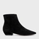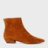 Bota de cano baixo em couro suede. Possui salto bloco baixo, bico fino alongado e zíper lateral para facilitar o calce.