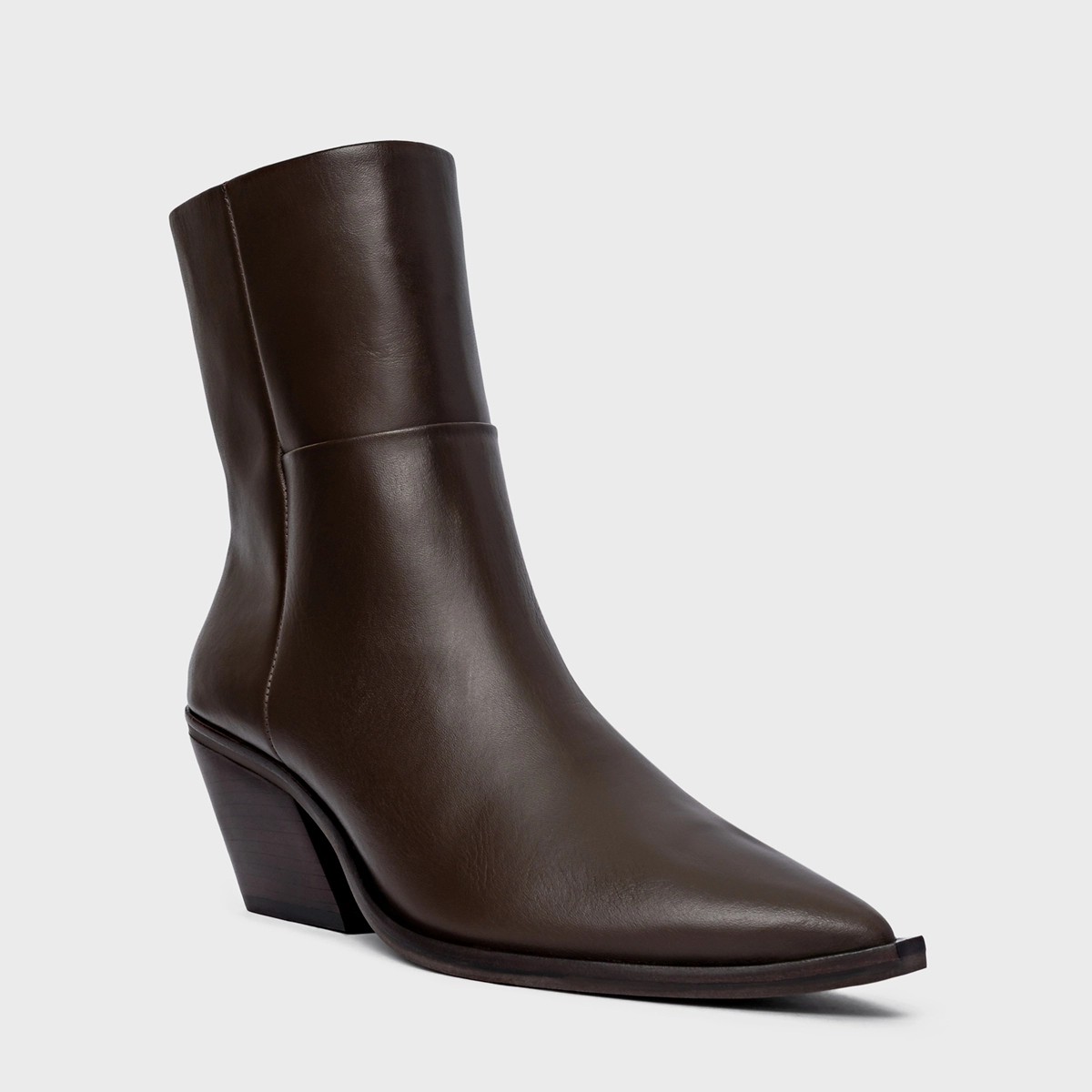 Bota western cano médio em couro, com bico fino e salto bloco. O modelo apresenta cabedal liso e fechamento por zíper lateral.