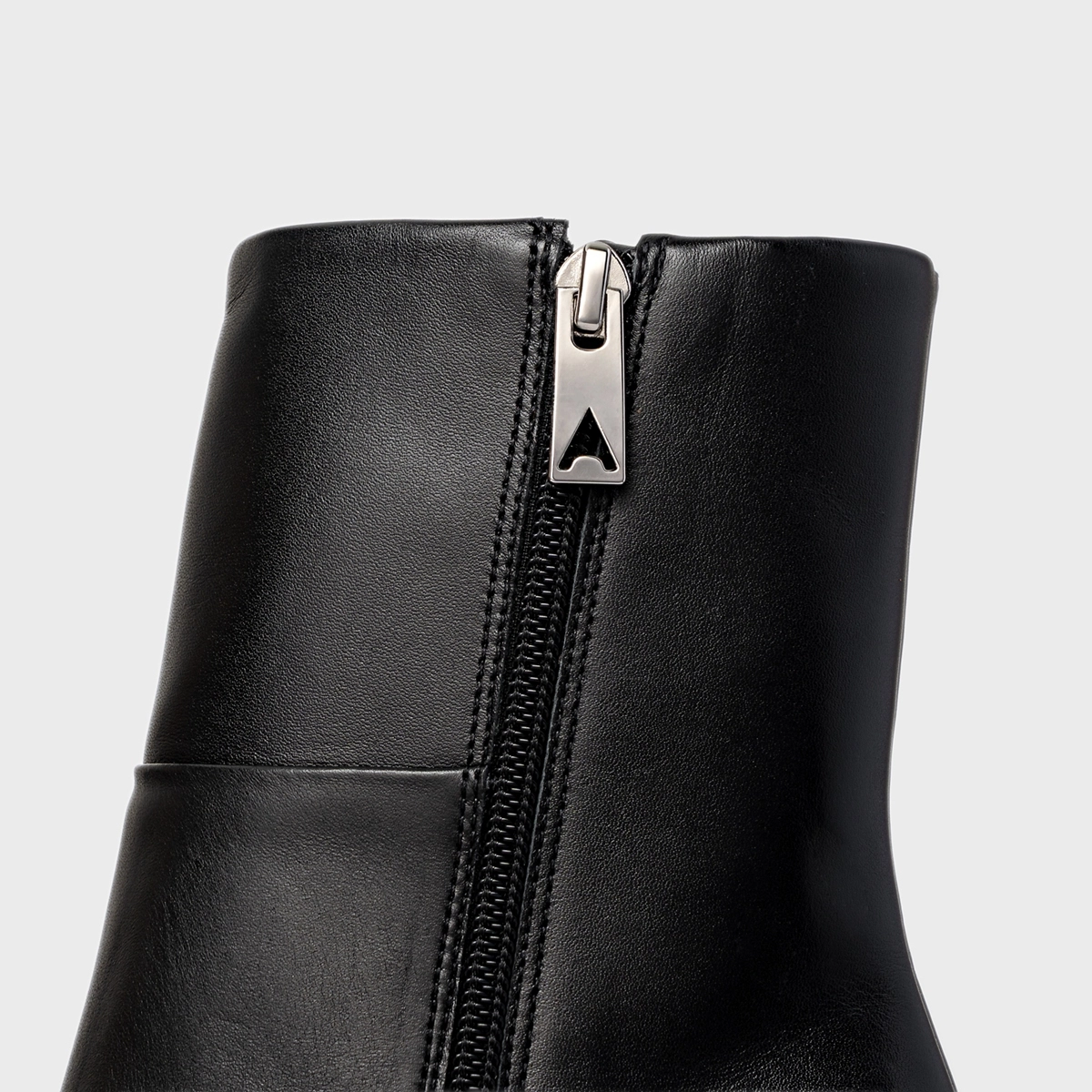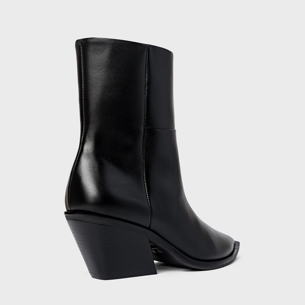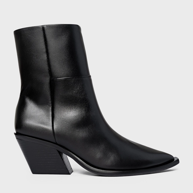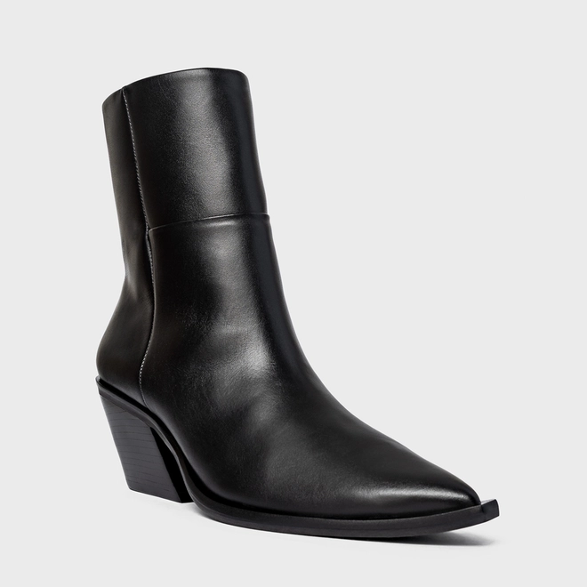 Bota western cano médio em couro, com bico fino e salto bloco. O modelo apresenta cabedal liso e fechamento por zíper lateral.