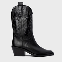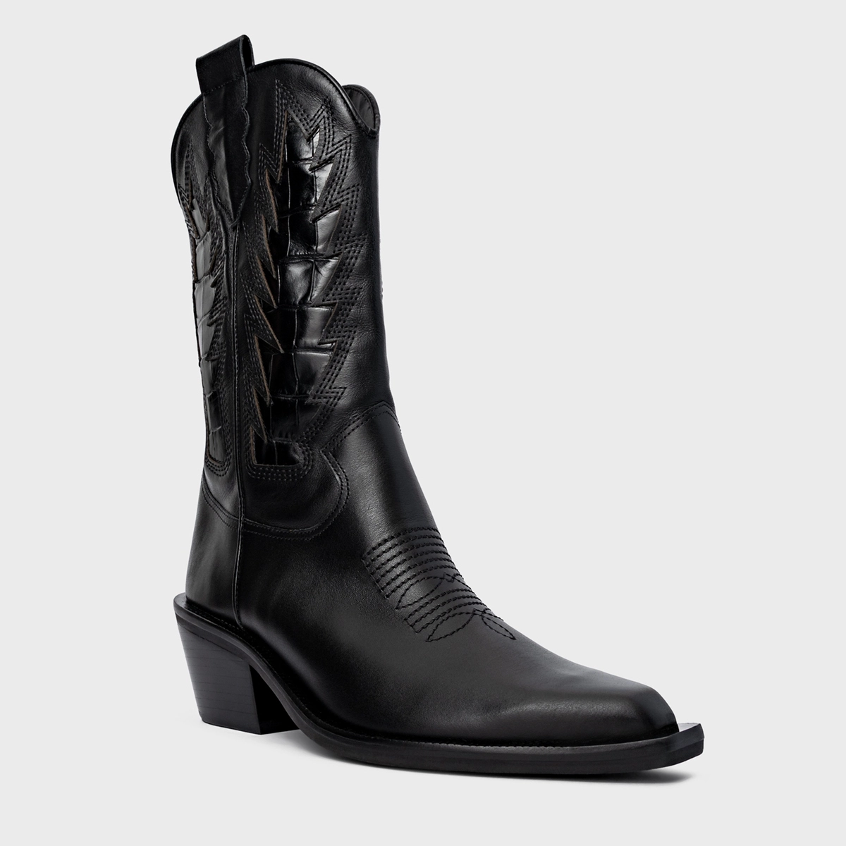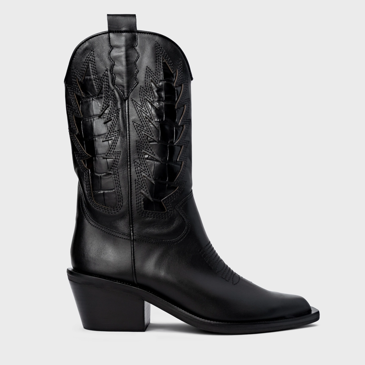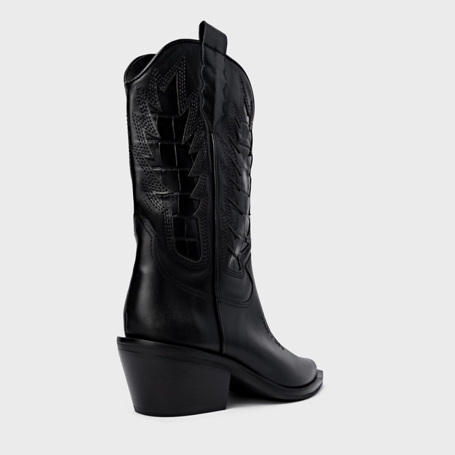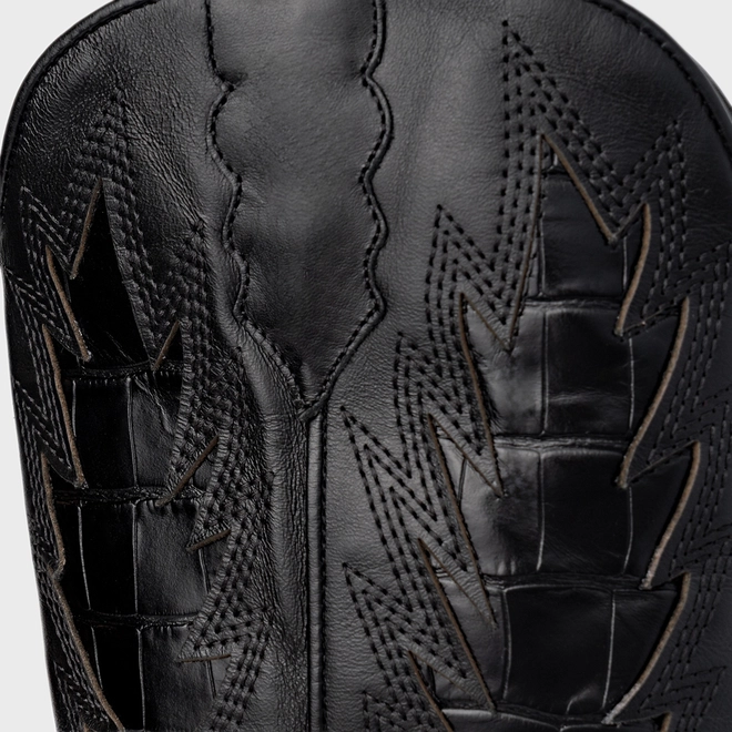 Bota western de cano alto em couro. Possui bordados em croco no cano, característicos da estética country, salto bloco, bico alongado com ponteira quadrada e puxadores laterais para facilitar o calce.