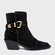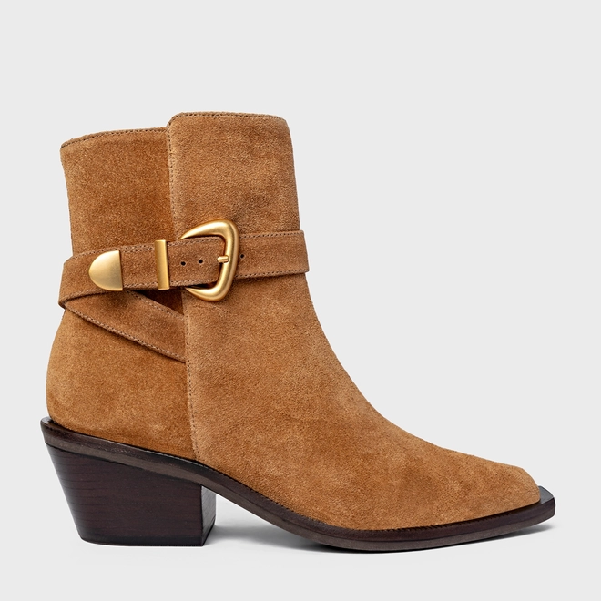 Bota western de cano médio em couro suede. Possui salto bloco, bico alongado com ponteira quadrada e tira com fivela que envolve o modelo.