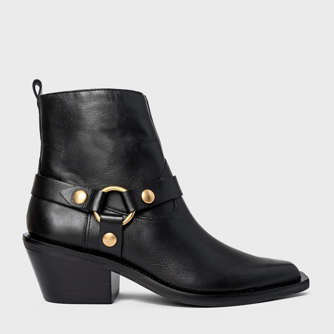 Bota western de cano médio em couro. Possui salto bloco médio, bico alongado com ponteira quadrada e tira com ilhós e metais que envolve o modelo. Fechamento em zíper lateral.