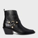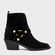 Bota western de cano médio em couro suede. Possui salto bloco médio, bico alongado com ponteira quadrada e tira com ilhós e metais que envolve o modelo. Fechamento em zíper lateral.