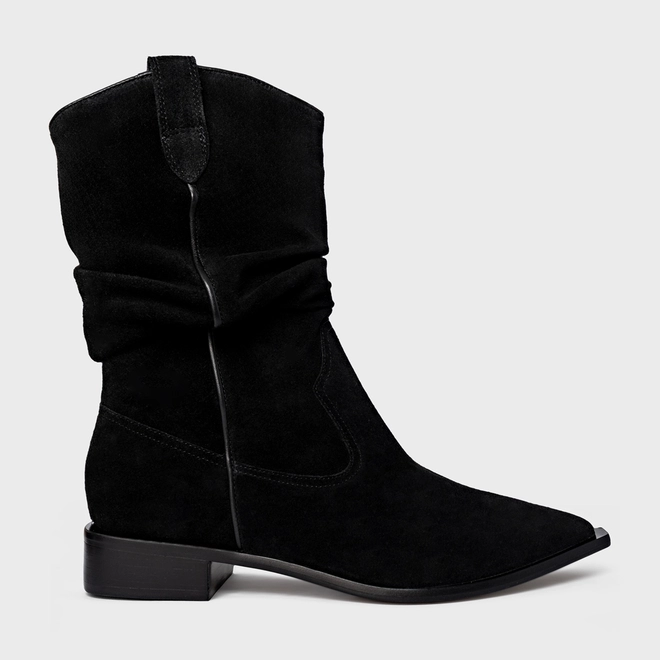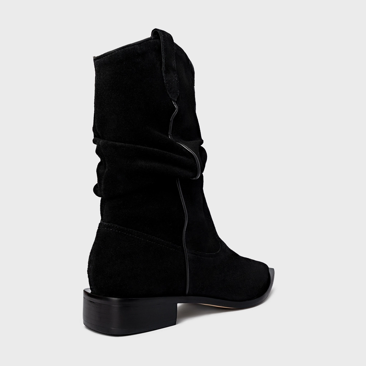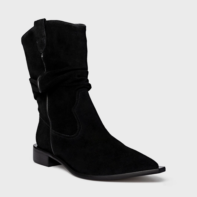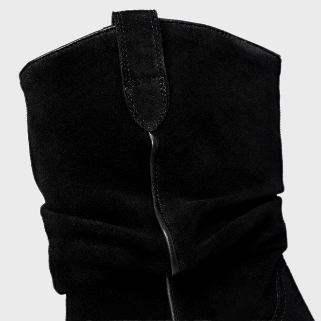 Bota western de cano médio slouchy em couro suede. Possui salto bloco, bico alongado com ponteira quadrada e puxador lateral para facilitar o calce.