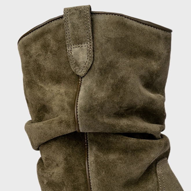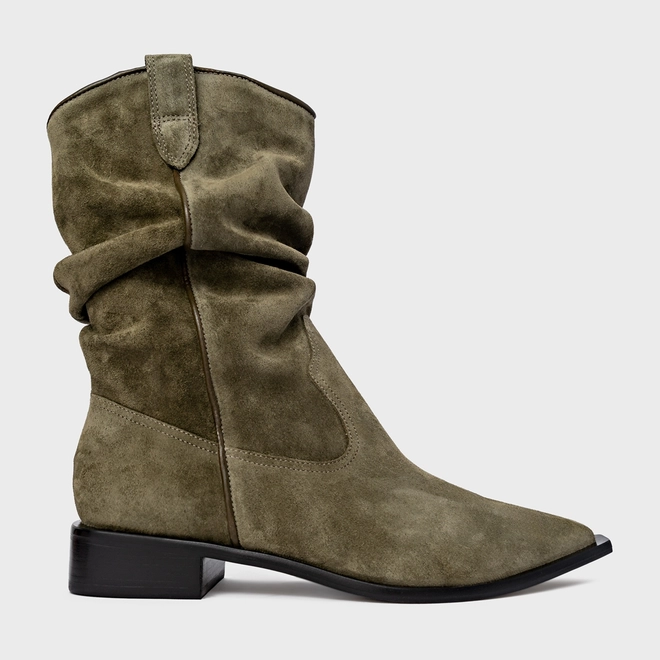 Bota western de cano médio slouchy em couro suede. Possui salto bloco, bico alongado com ponteira quadrada e puxador lateral para facilitar o calce.
