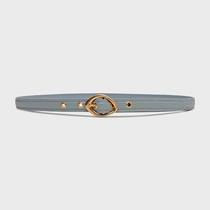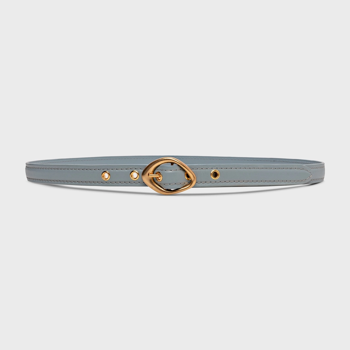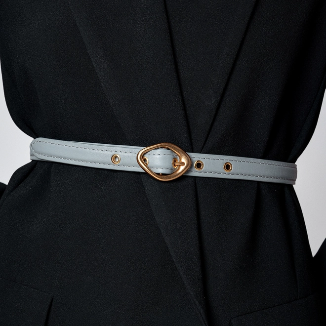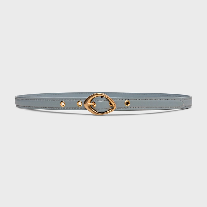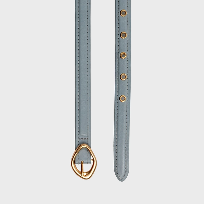 Cinto de couro com shape fino, fivela em metal dourado com design orgânico e furos com ilhoses aplicados.
