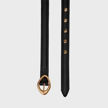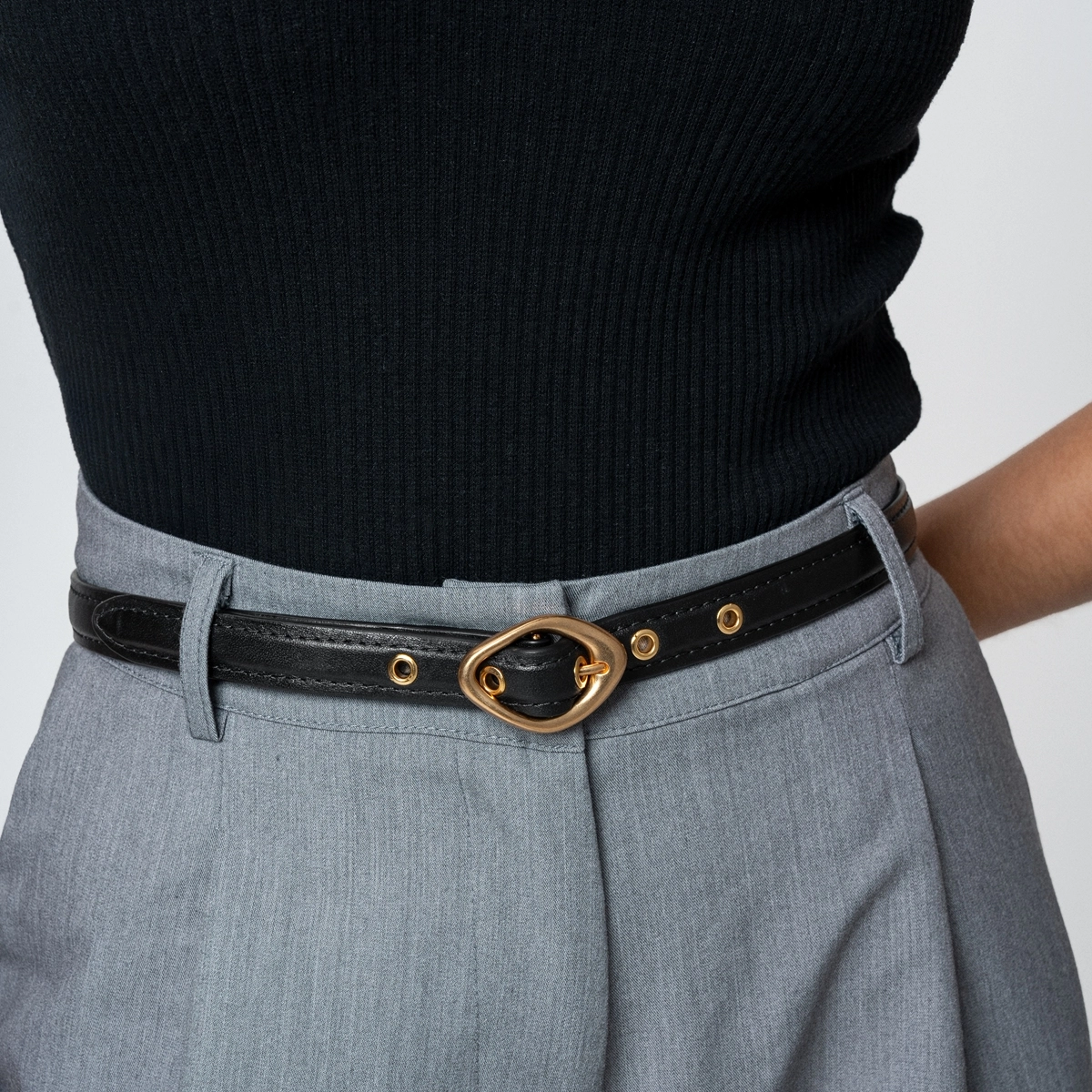 Cinto de couro com shape fino, fivela em metal dourado com design orgânico e furos com ilhoses aplicados.