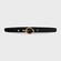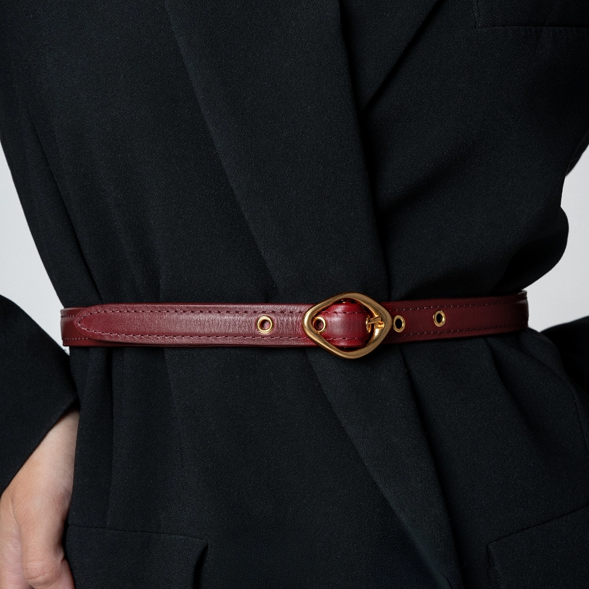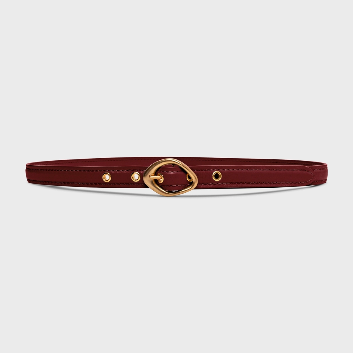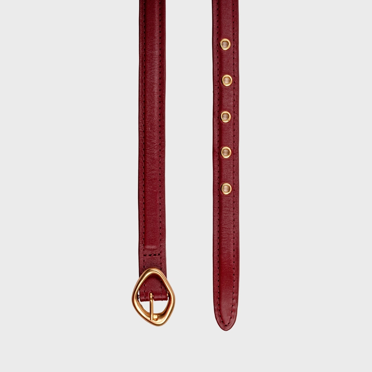 Cinto de couro com shape fino, fivela em metal dourado com design orgânico e furos com ilhoses aplicados.