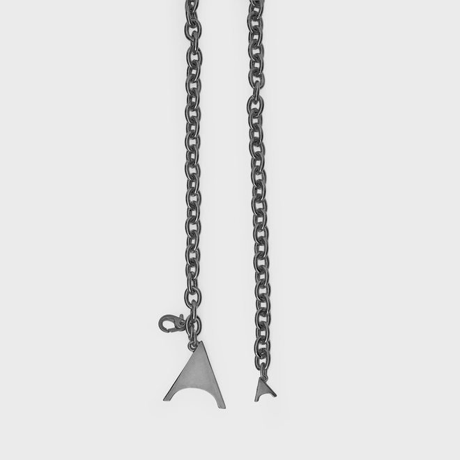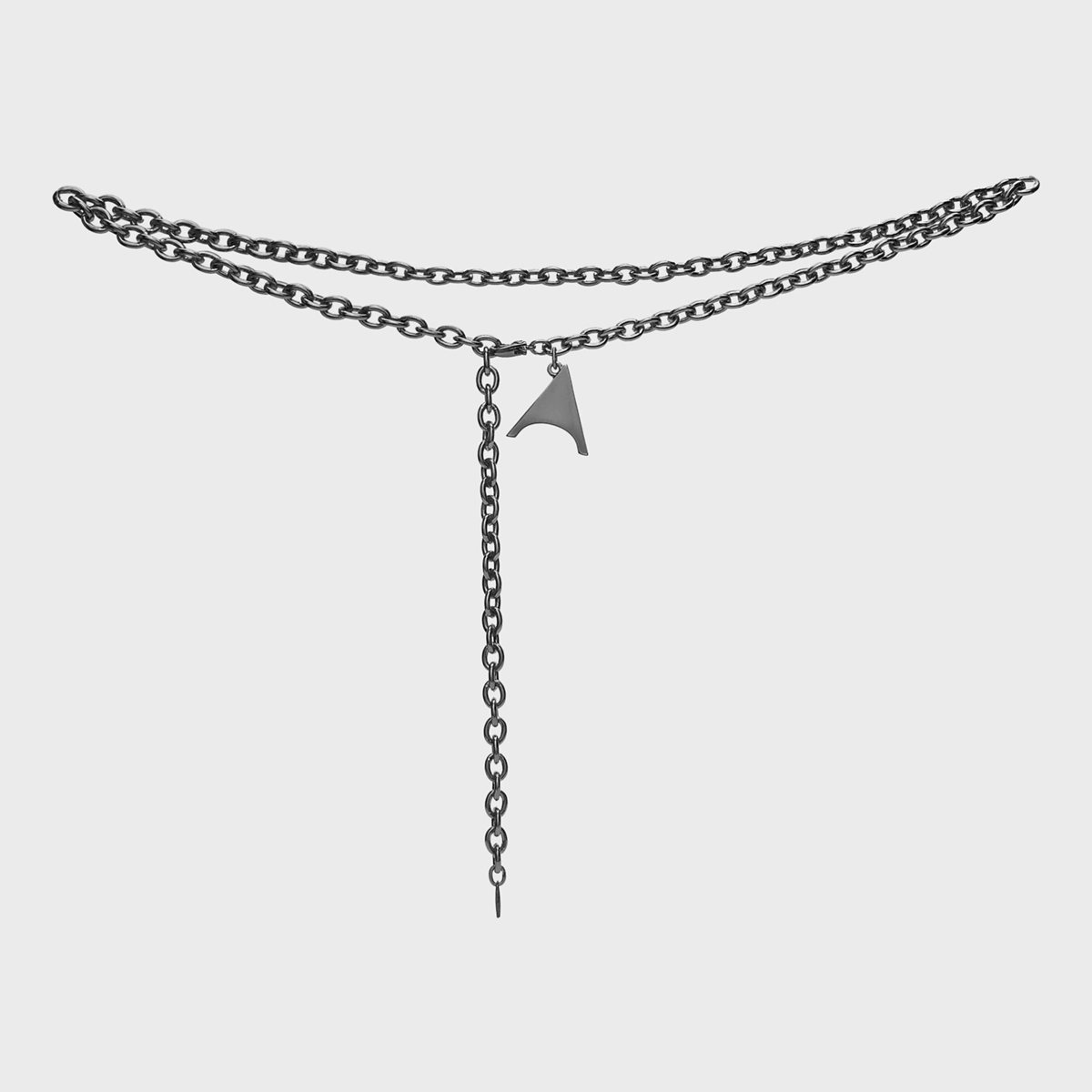 Cinto de corrente que envolve a cintura. Conta com pingente do ícone Carrano, adicionando um charme extra e um visual marcante.