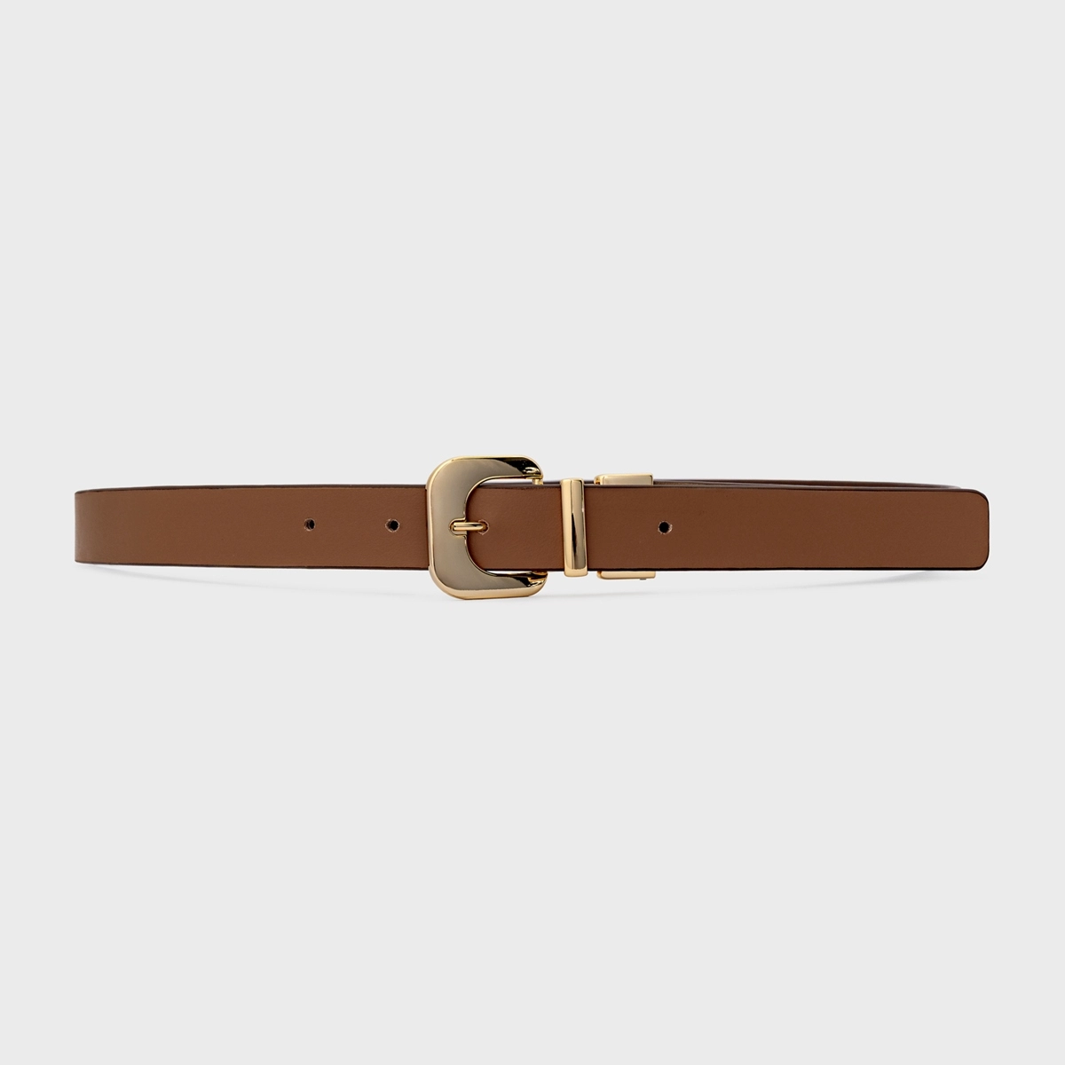 Cinto em couro, com design estreito e acabamento liso. Possui fivela metálica de formato orgânico, passador metálico e ajuste por furos.