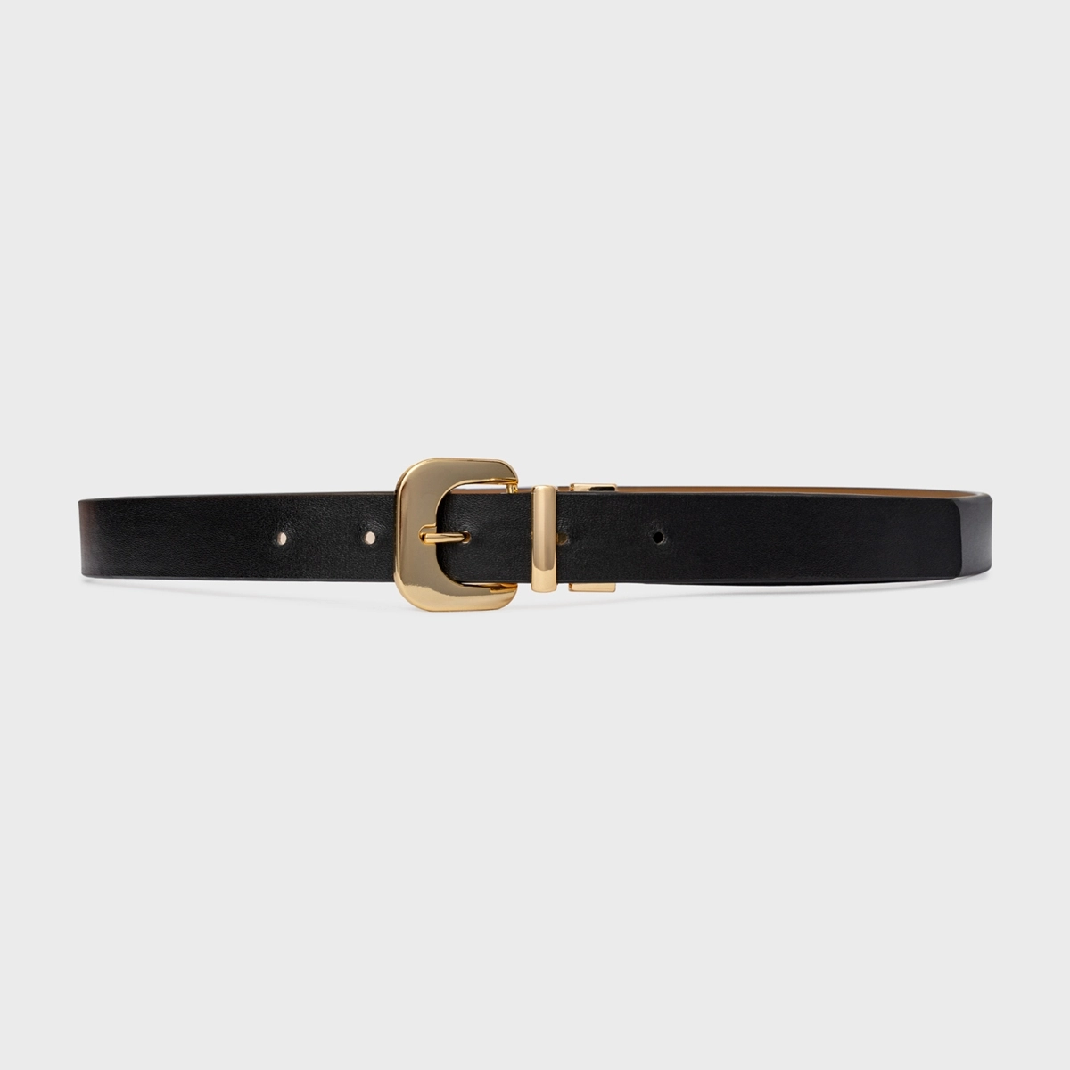 Cinto em couro, com design estreito e acabamento liso. Possui fivela metálica de formato orgânico, passador metálico e ajuste por furos.