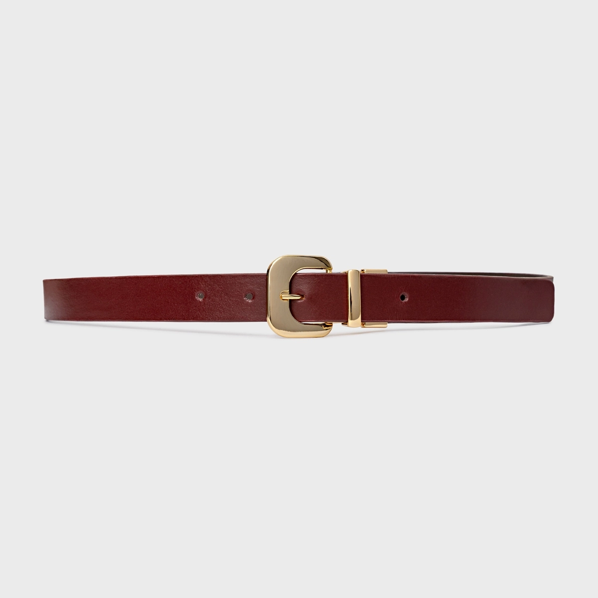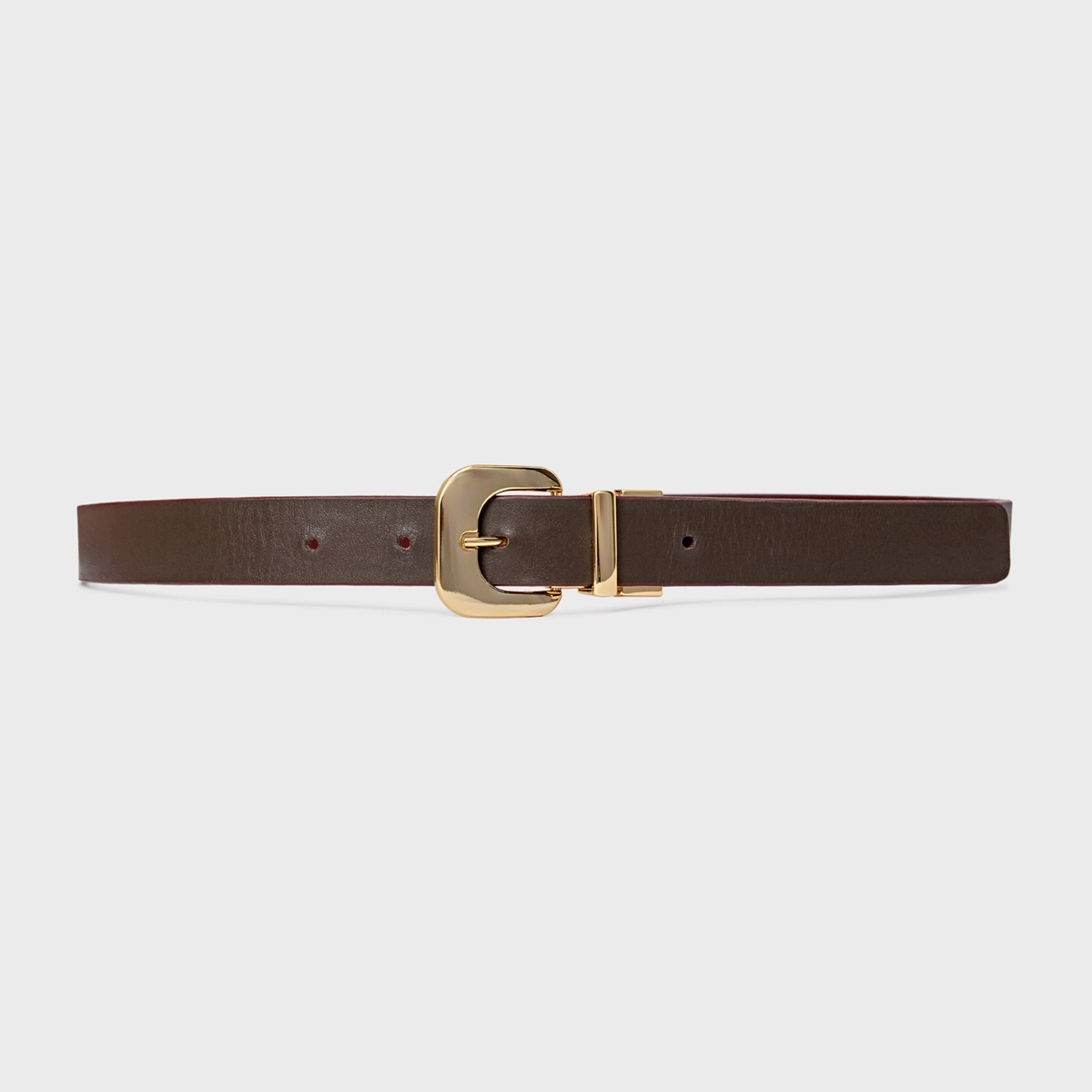 Cinto em couro, com design estreito e acabamento liso. Possui fivela metálica de formato orgânico, passador metálico e ajuste por furos.
