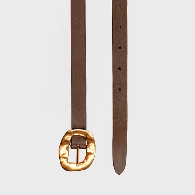 Cinto de couro com espessura fina e fivela em metal dourado com design orgânico ultra bold.