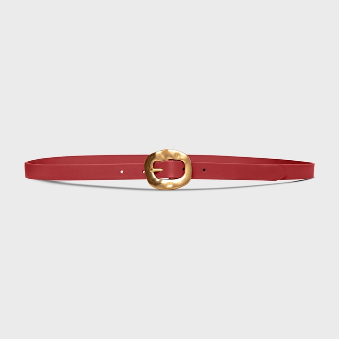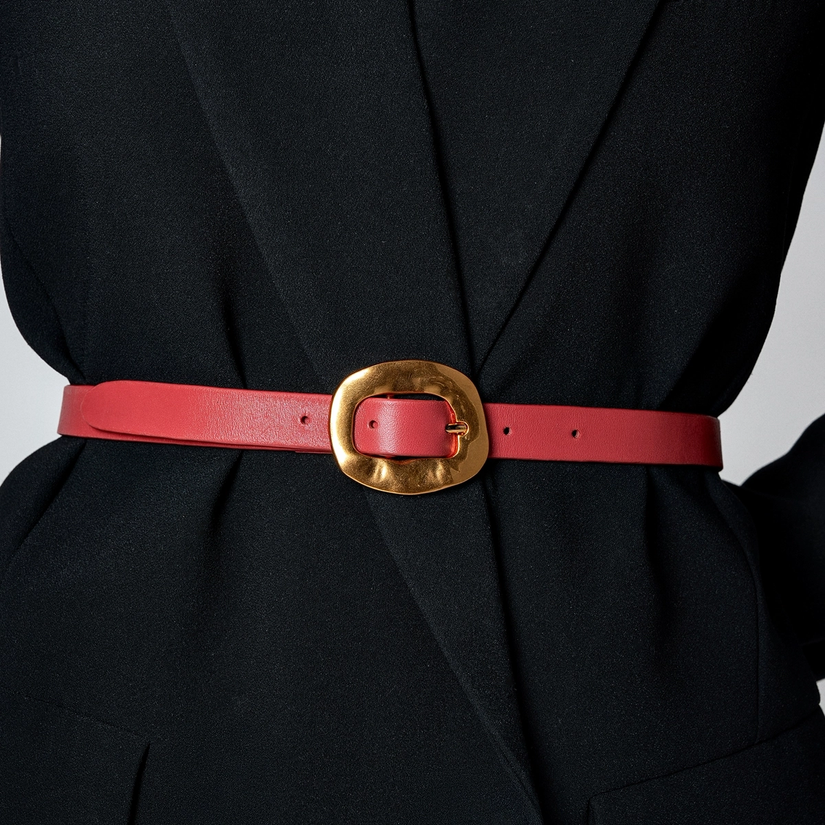 Cinto de couro com espessura fina e fivela em metal dourado com design orgânico ultra bold.