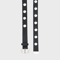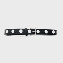 Cinto de couro com shape médio, passador simples. Fivela marcante em metal, design mais quadrado e com enchimento. Rebites marcantes que trazem atitude para a produção.