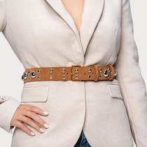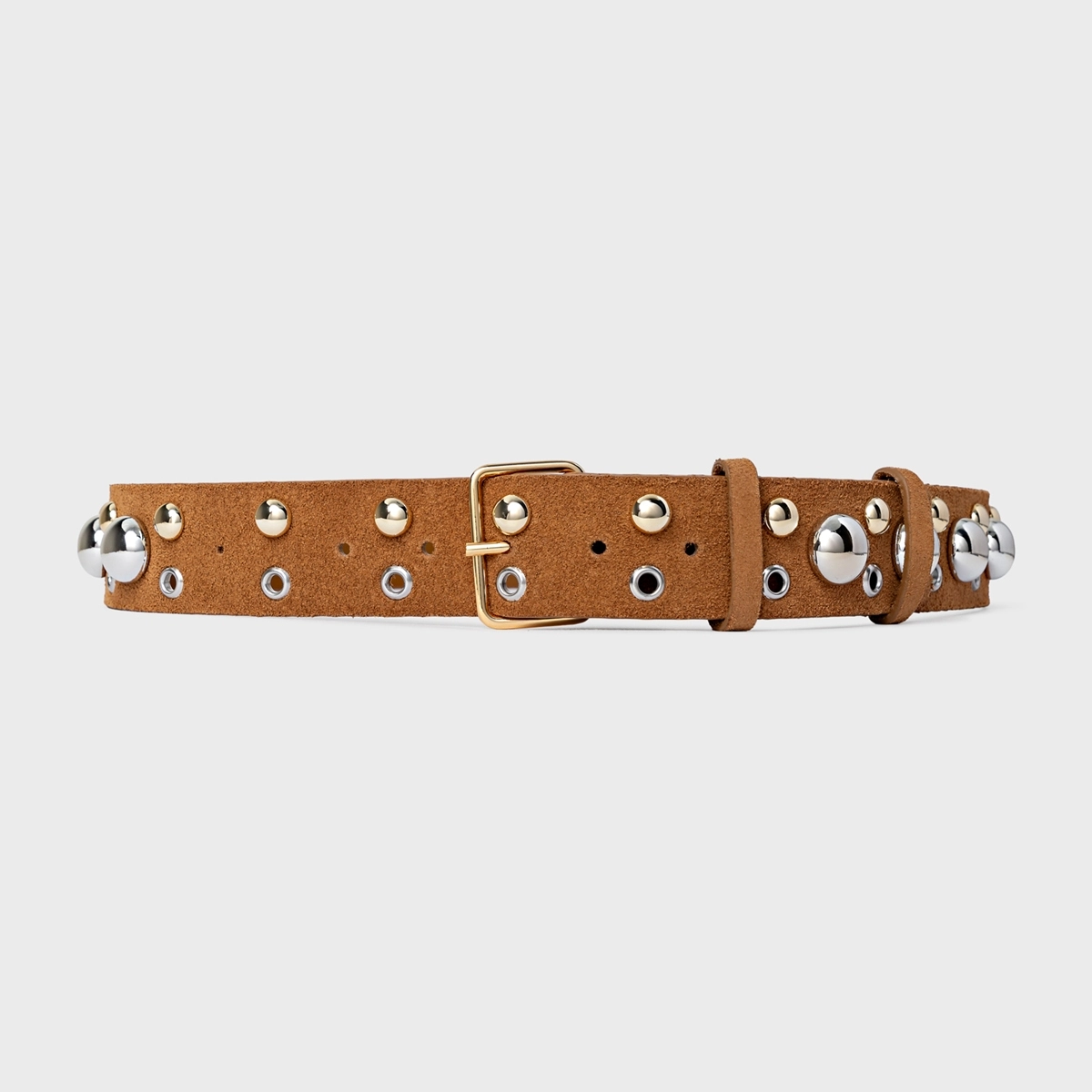 Cinto em couro suede, com design estreito e acabamento liso. Possui fivela metálica, ilhós e aplicações metálicas de diferentes tamanhos ao longo do comprimento, além de ajuste por furos.