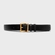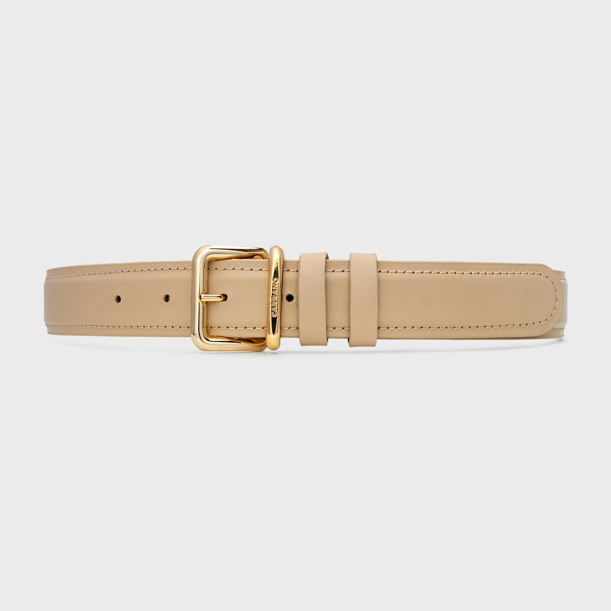 Cinto de couro com espessura grossa e passador duplo. Fivela em metal dourado, com design arredondado e detalhe acolchoado.