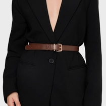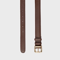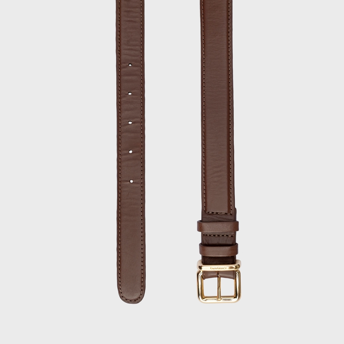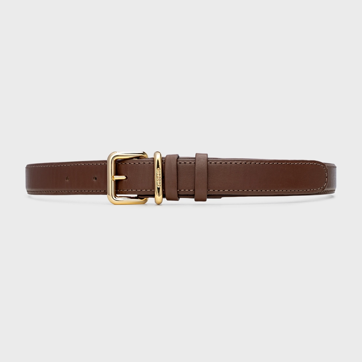 Cinto de couro com espessura fina e passador duplo. Fivela em metal dourado, com design arredondado e detalhe acolchoado.