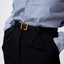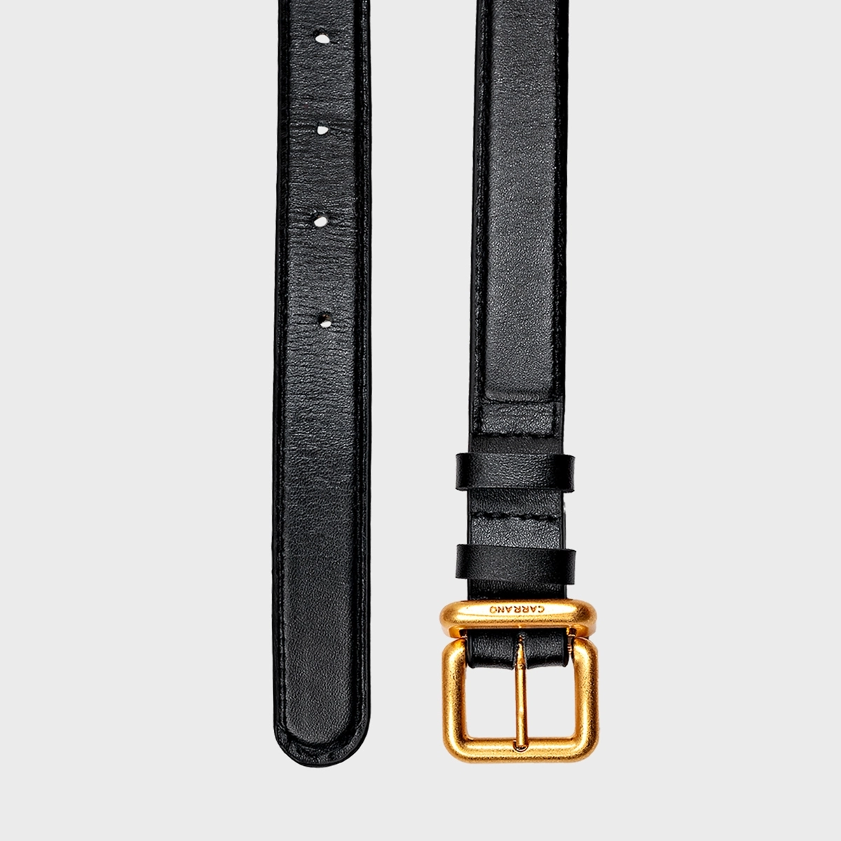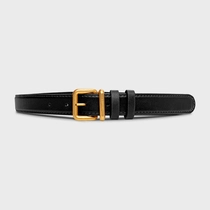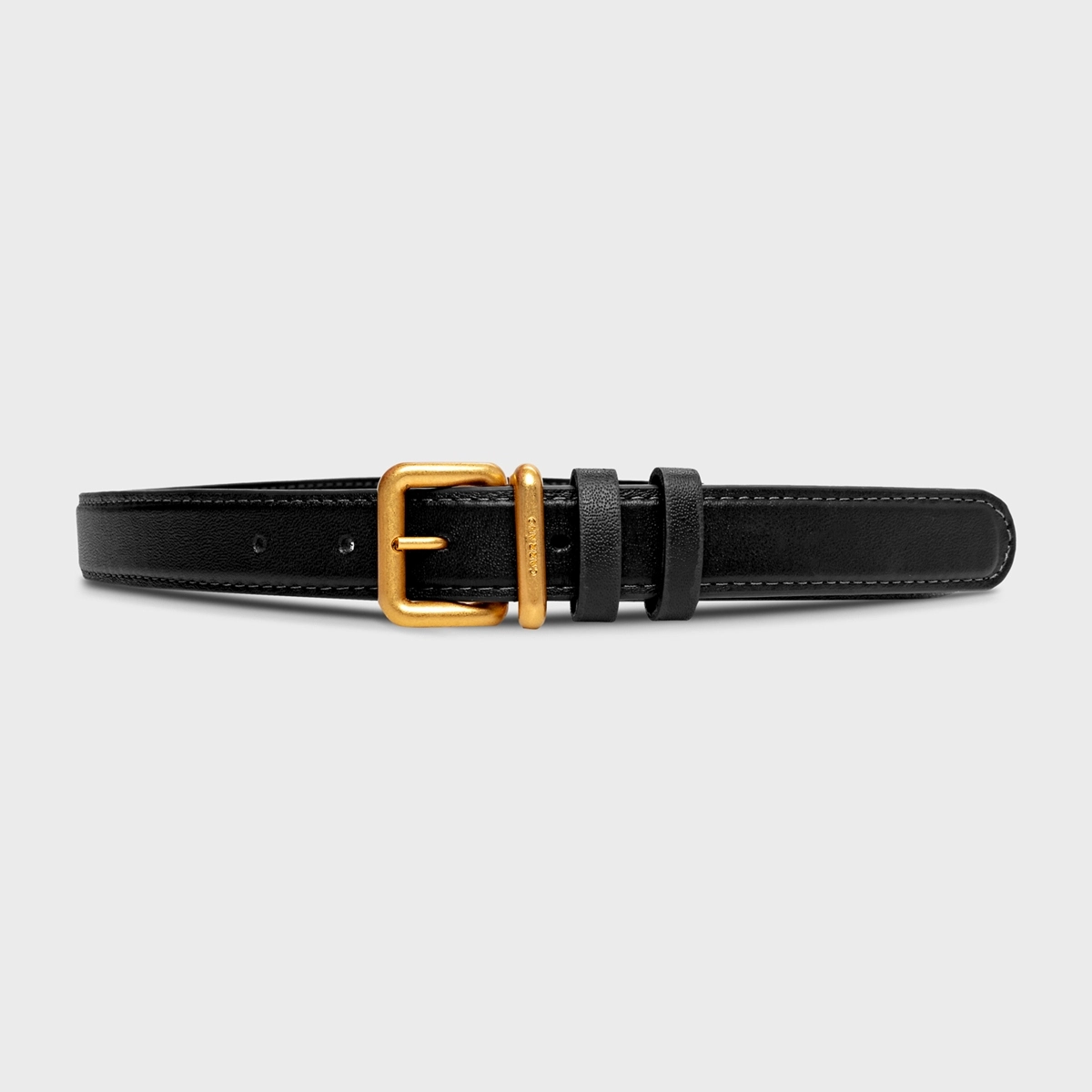 Cinto de couro com espessura fina e passador duplo. Fivela em metal dourado, com design arredondado e detalhe acolchoado.