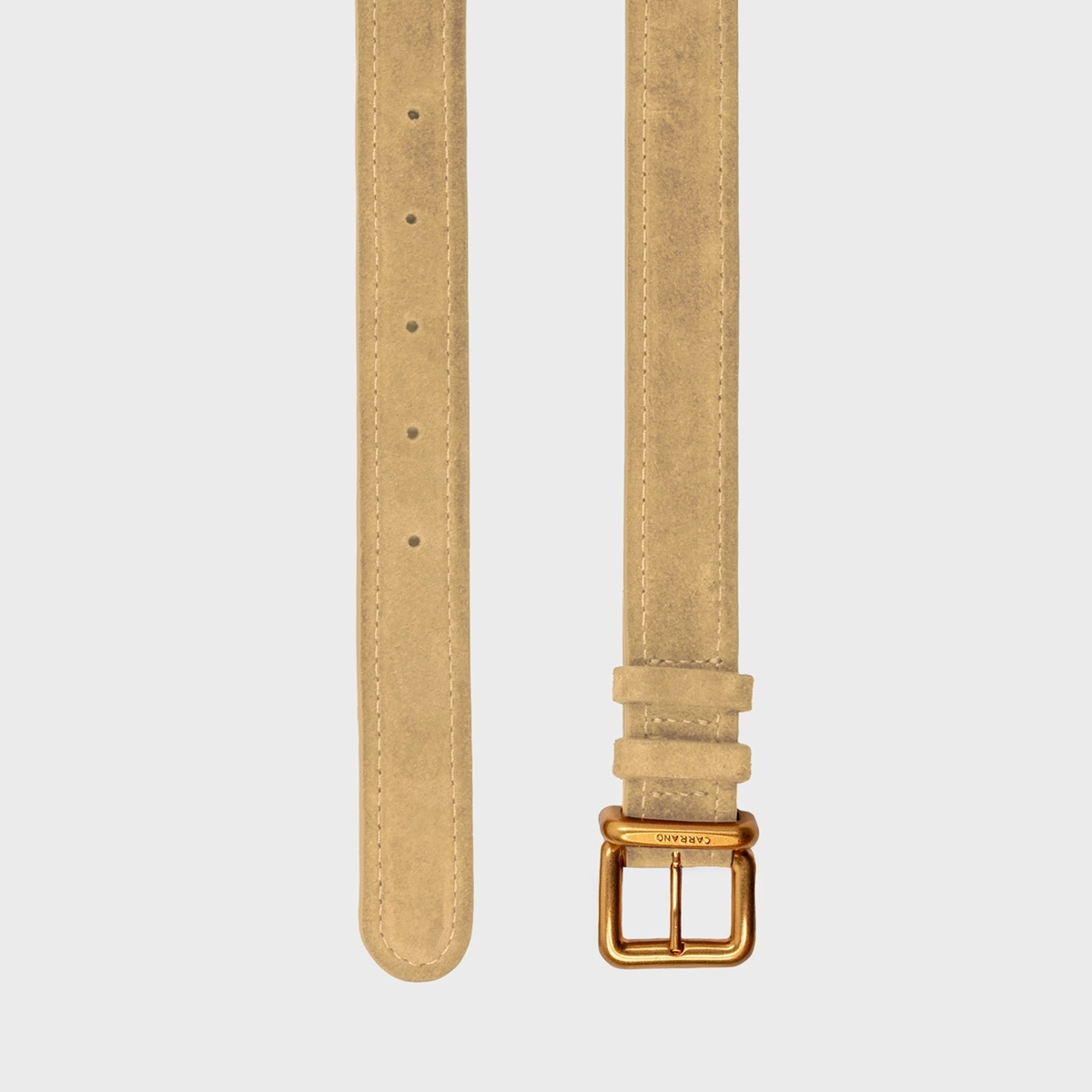 Cinto de couro com espessura fina e passador duplo. Fivela em metal dourado, com design arredondado e detalhe acolchoado.