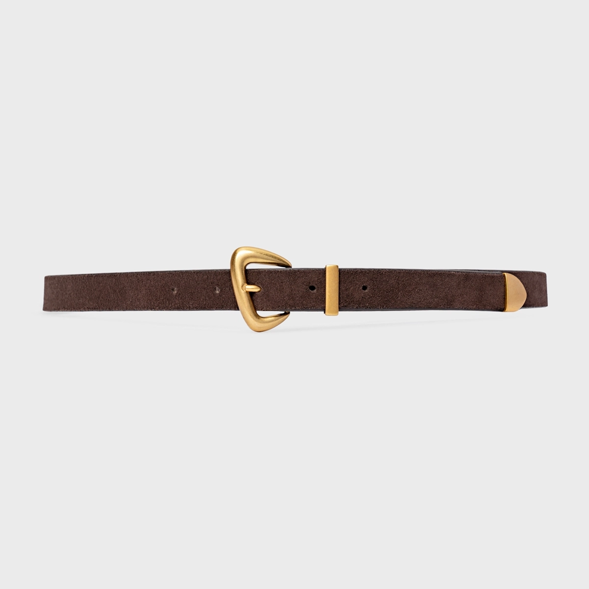 Cinto em couro suede, com design estreito e acabamento liso. Possui fechamento por fivela metálica de formato orgânico, passador metálico e ajuste por furos.