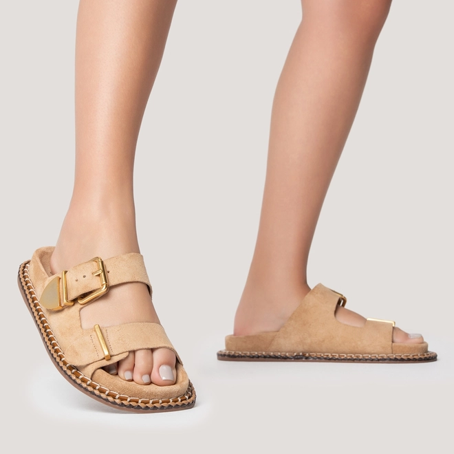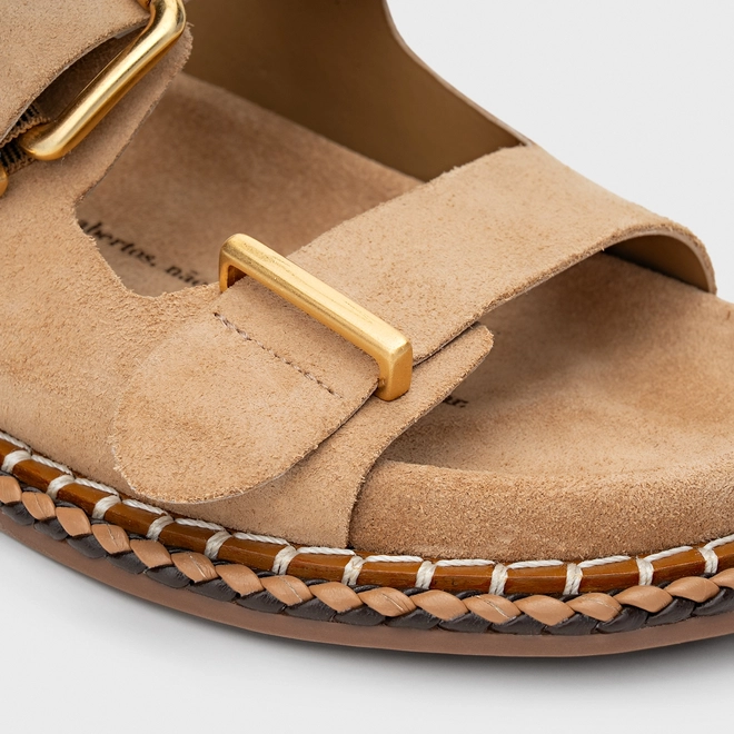 Flat em couro suede com bico arredondado. Possui duas tiras largas com fivelas metálicas douradas e solado com acabamento trançado. Aberta, une conforto, estilo e autenticidade artesanal.