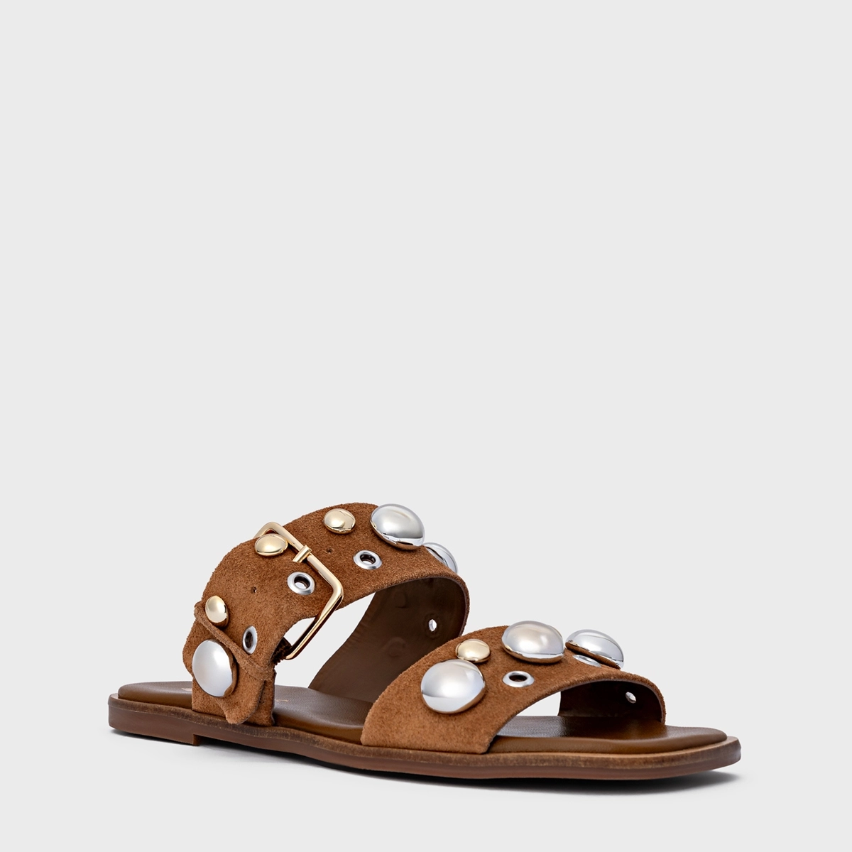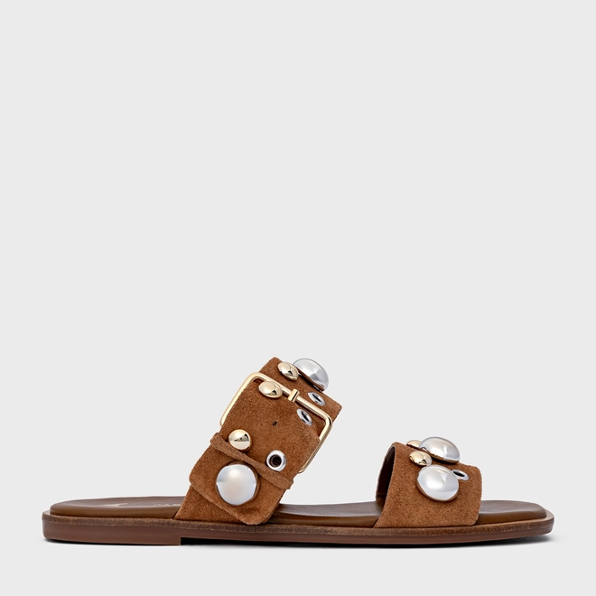 Flat estilo birken em couro suede, com salto rasteiro e bico arredondado. Conta com duas tiras largas com fivelas ajustáveis que possuem adornos. Aberto, deixa todo pé à mostra.