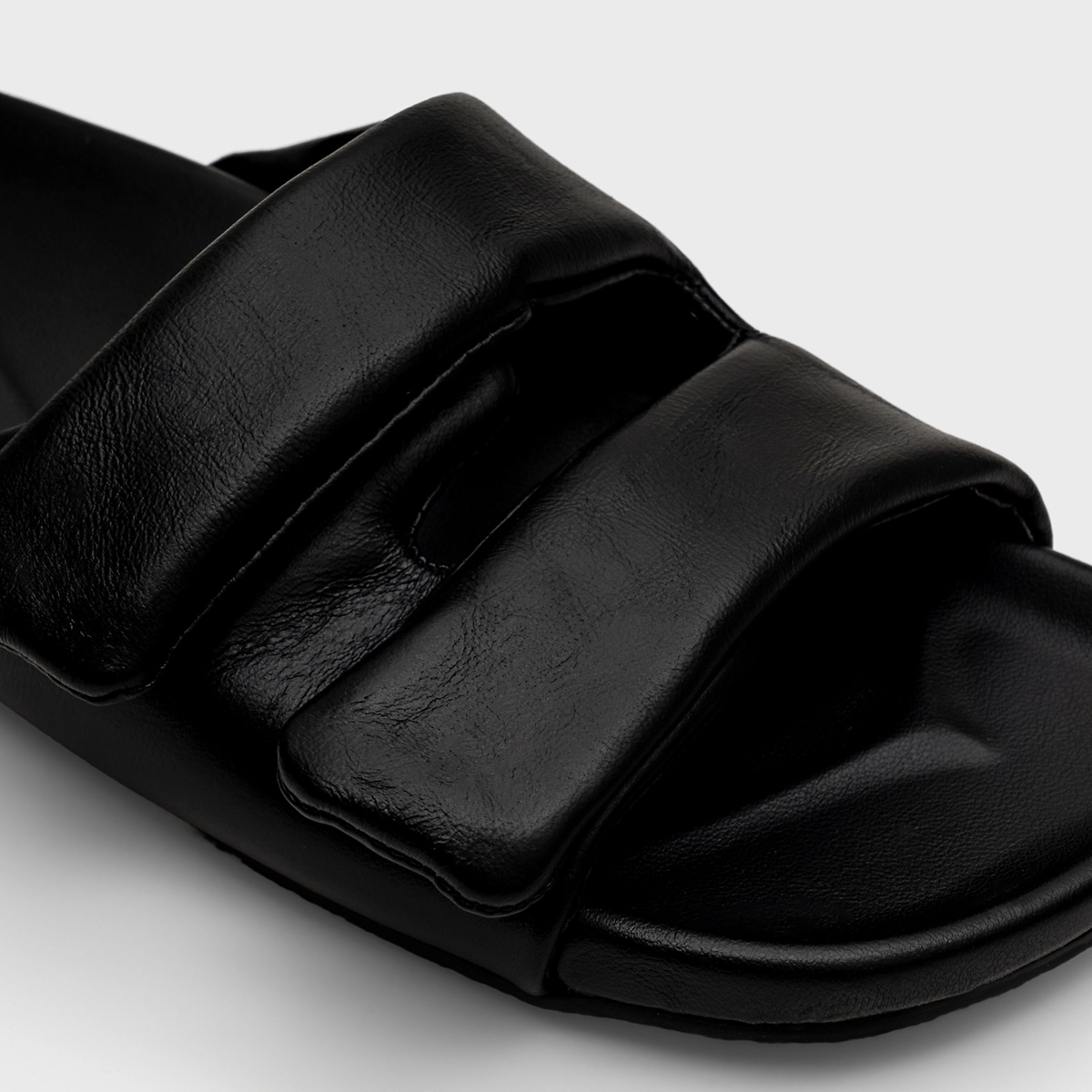 Flat de couro estilo birken, com salto rasteiro e bico quadrado. Possui duas tiras largas com fechamento em velcro sobre o peito do pé. Modelo aberto, deixa dedos e calcanhar à mostra.