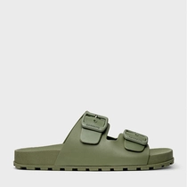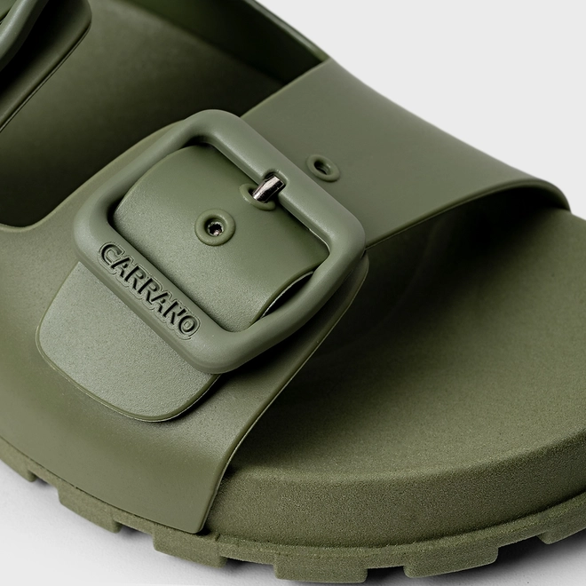 Flat estilo birken em PVC, com base levemente tratorada. Possui duas tiras largas com fivelas ajustáveis sobre o peito do pé. Modelo aberto, deixa dedos e calcanhar à mostra.