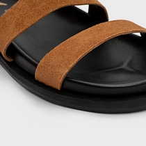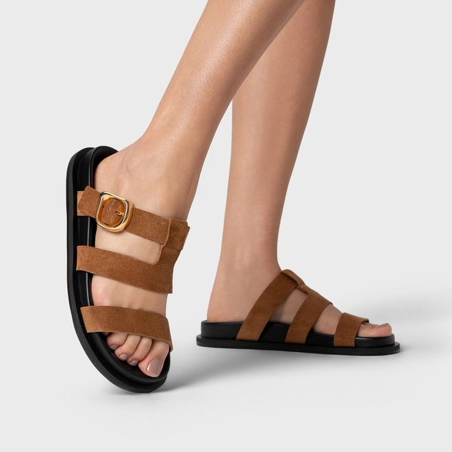 Flat Papete Buckle Triple Tiras Couro Suede Marrom Saddle