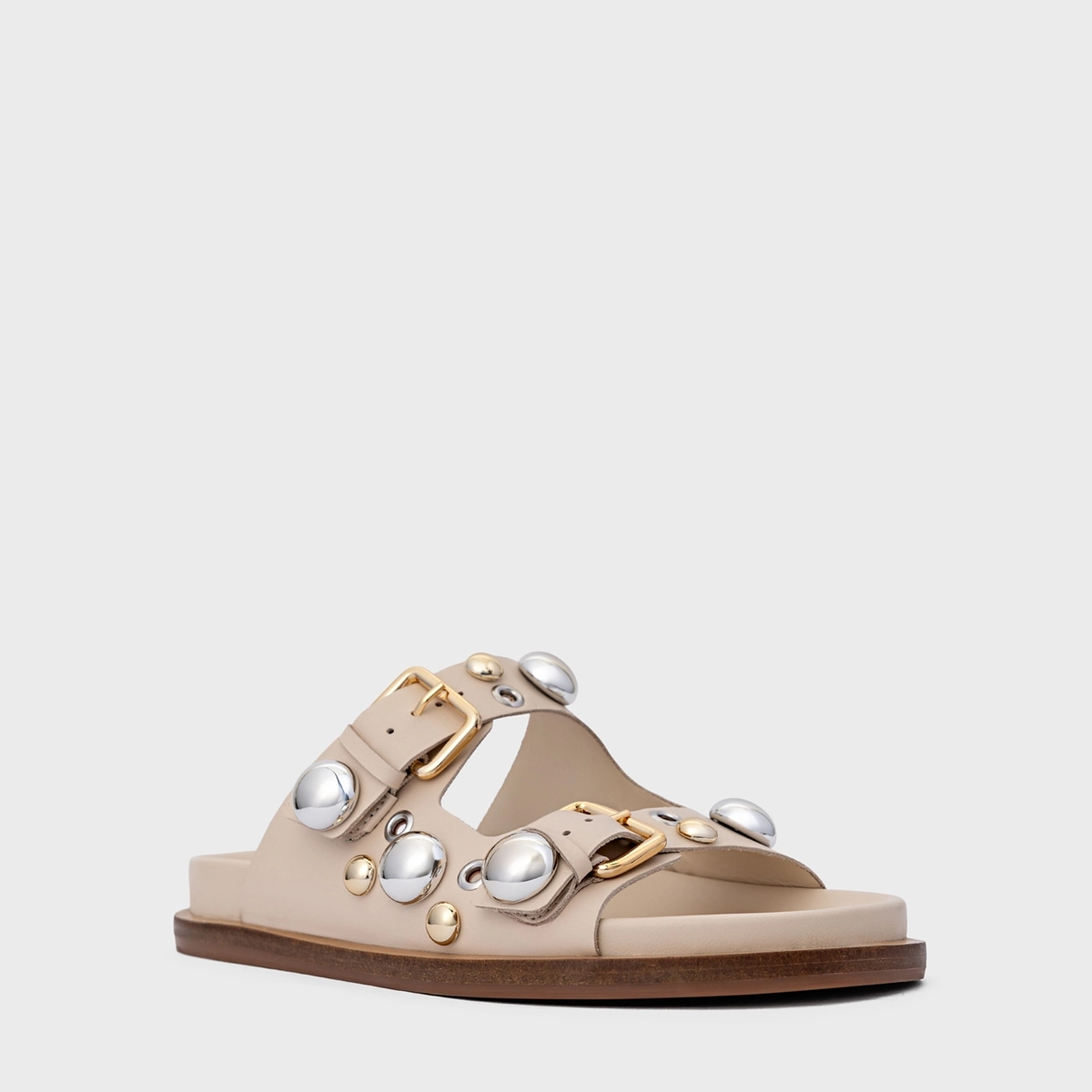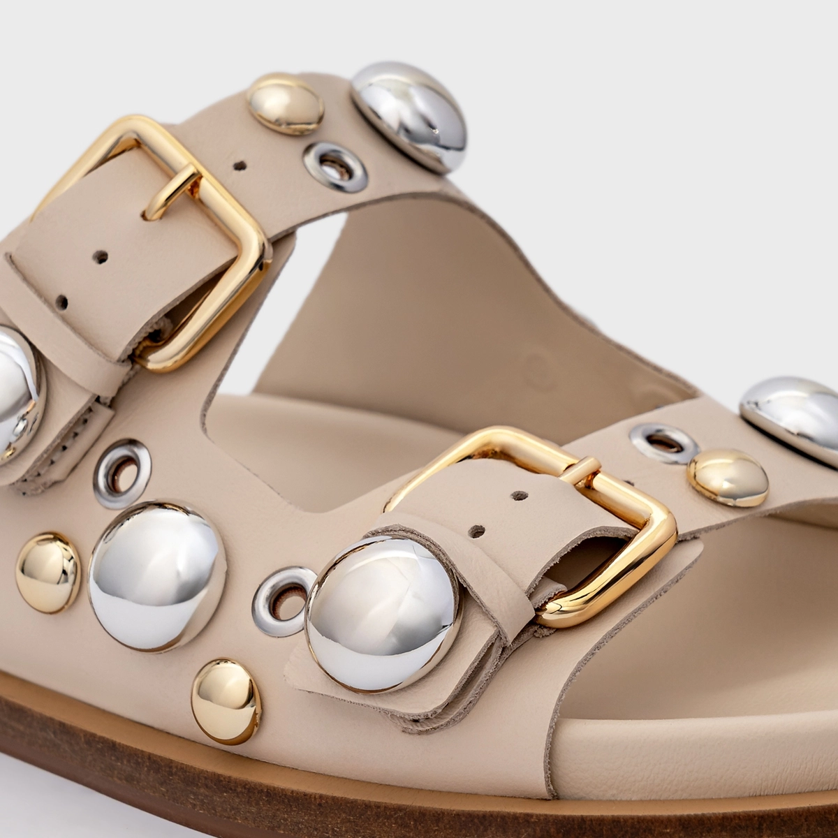 Flat papete estilo birken de couro, com salto rasteiro e bico arredondado. Conta com duas tiras largas com fivelas ajustáveis que possuem adornos. Aberto, deixa todo pé à mostra.