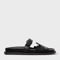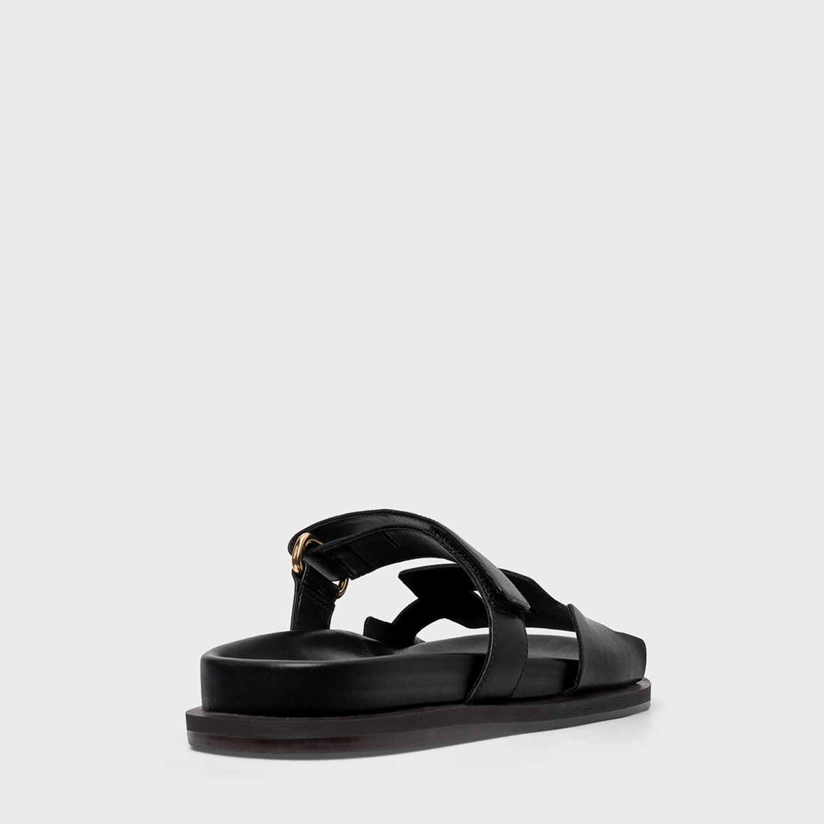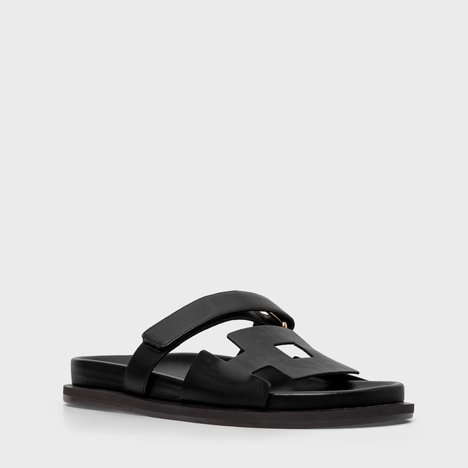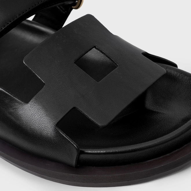 Flat papete de couro com salto rasteiro e bico arredondado. Conta com uma tira em formato quadrado e outra em velcro sobre o peito do pé.