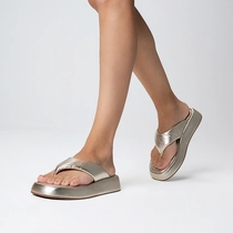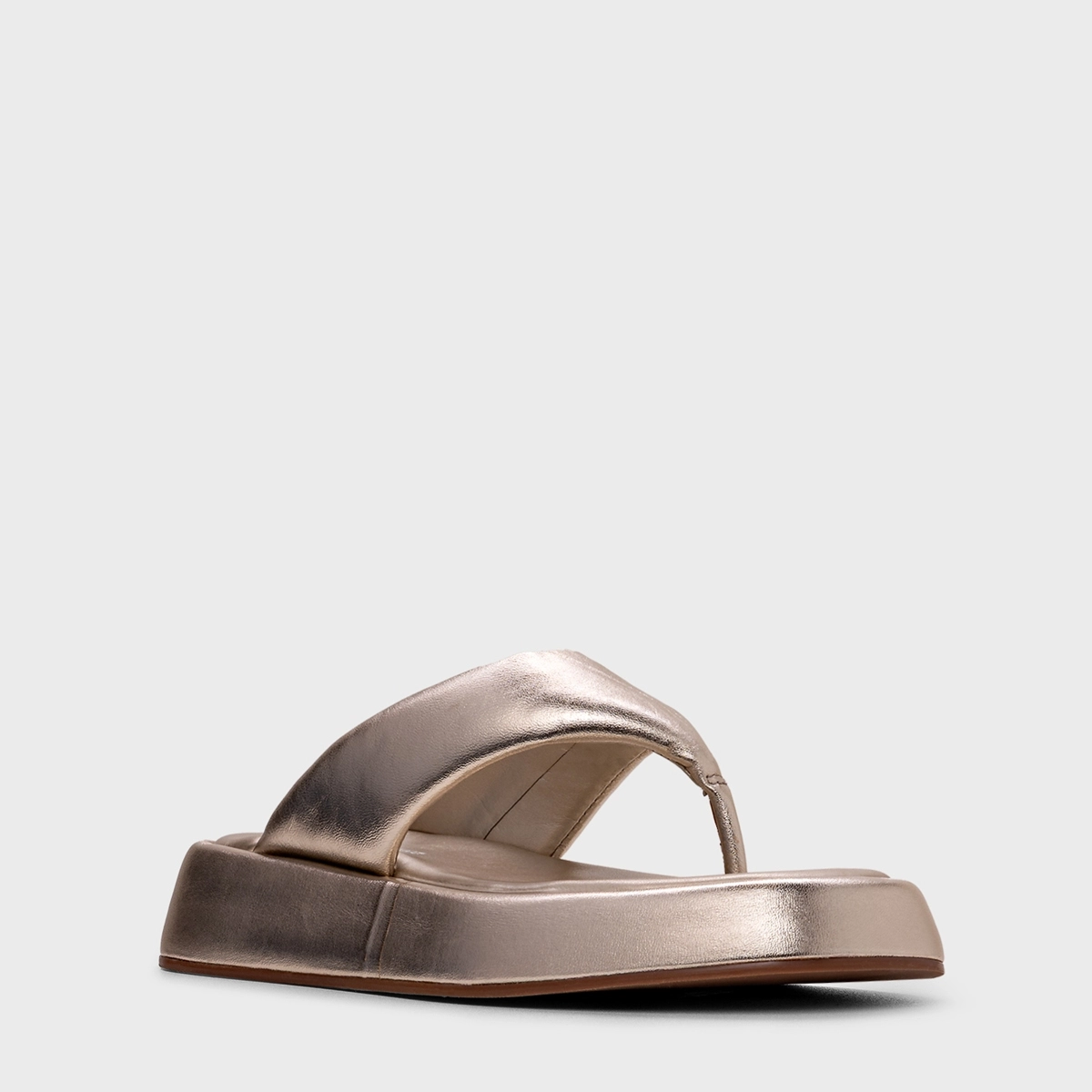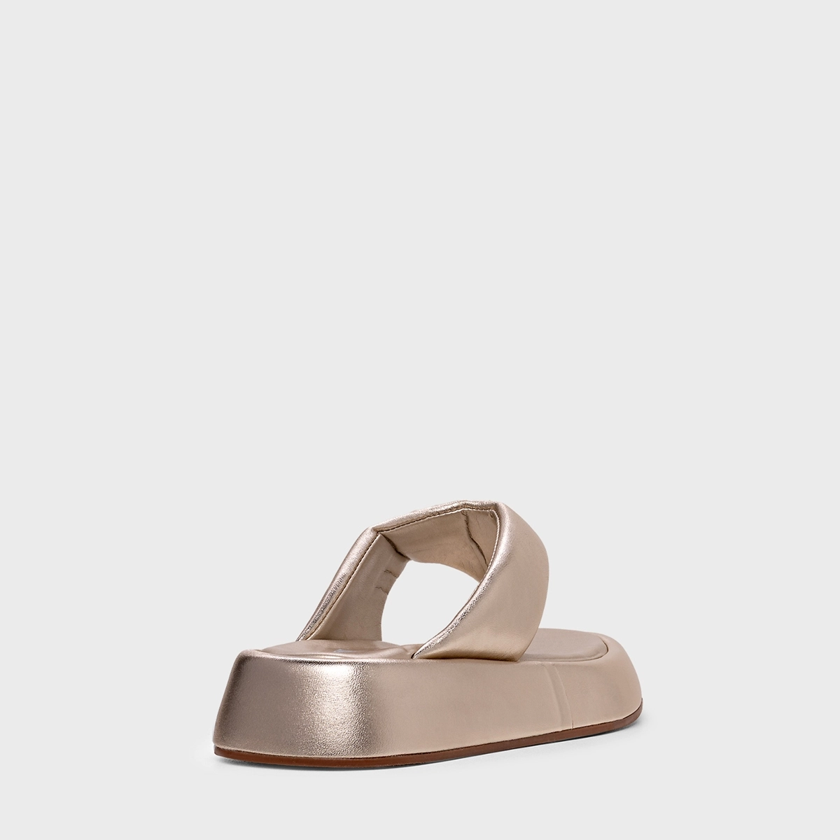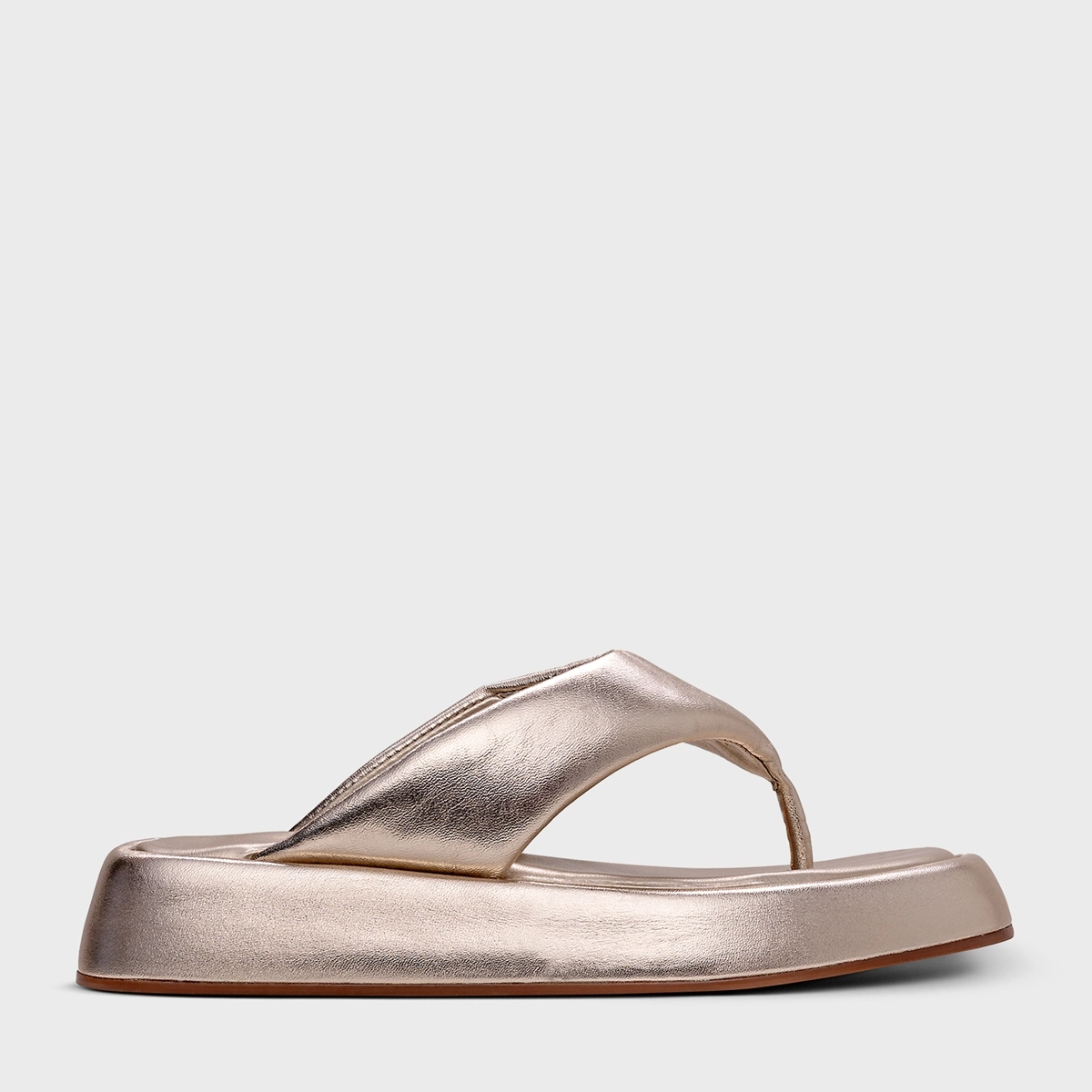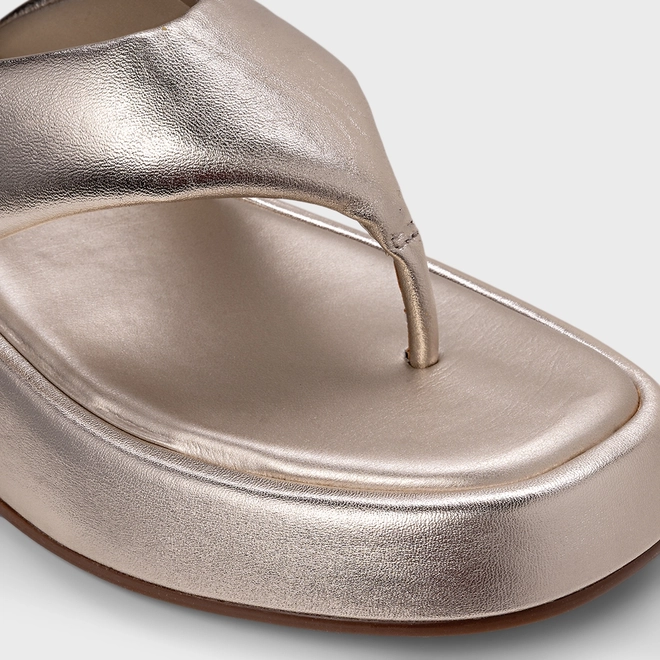 Flat papete thong em couro com bico arredondado e salto flatform. Modelo aberto estilo chinelo, com tiras largas e acolchoadas que dividem os dedos.