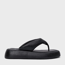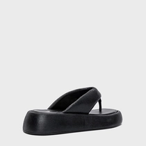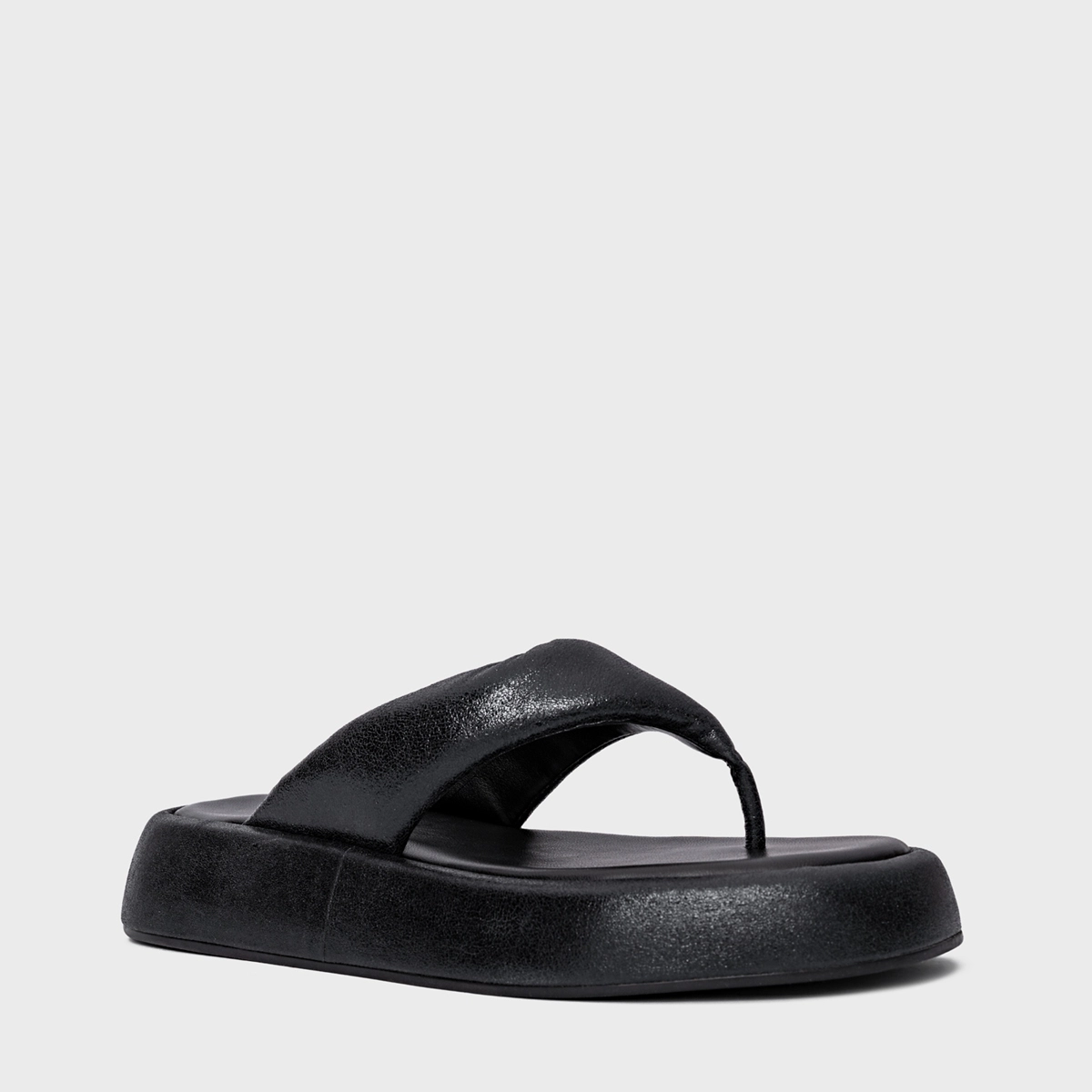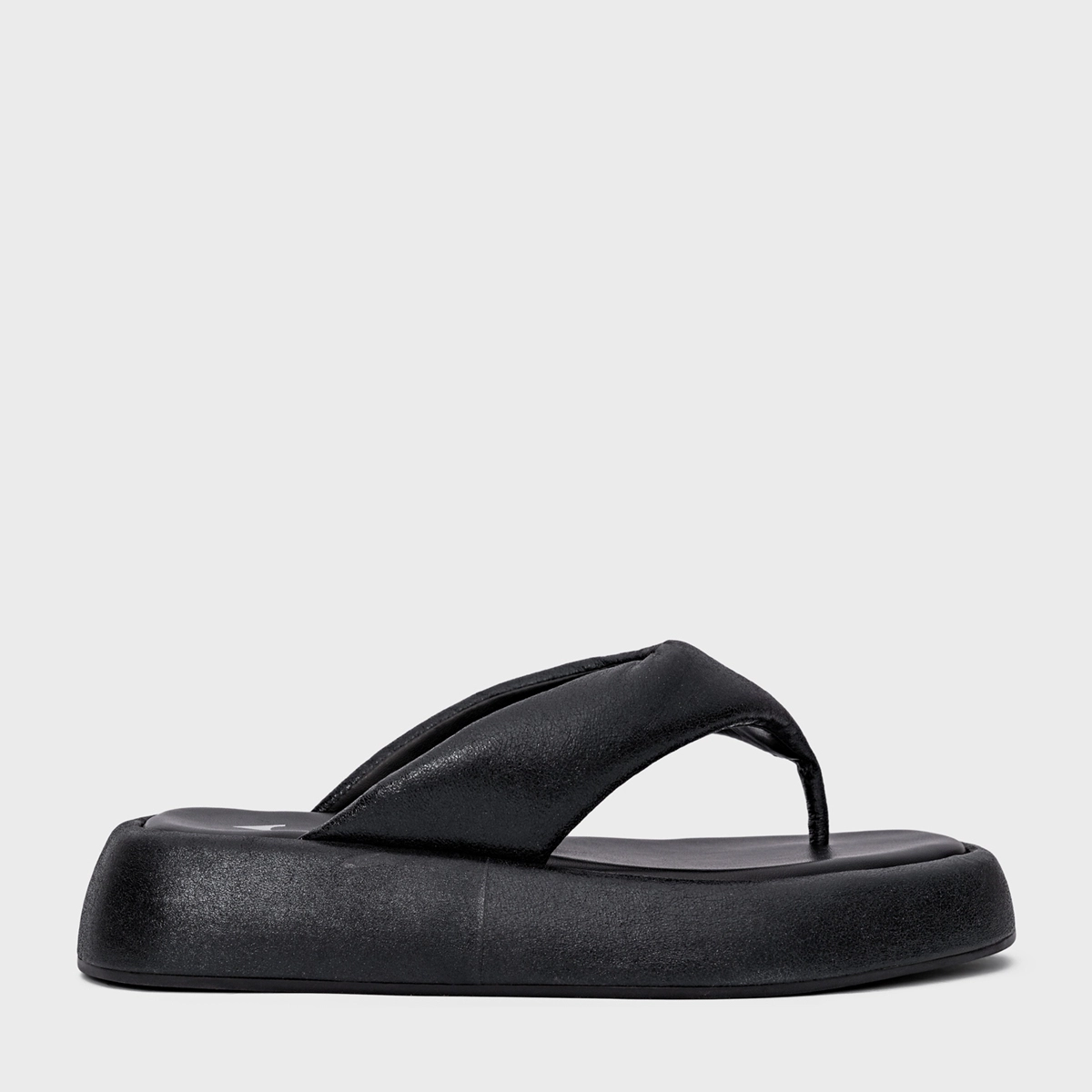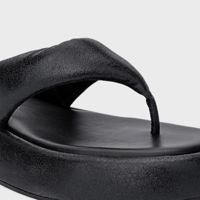 Flat papete thong em couro com bico arredondado e salto flatform. Modelo aberto estilo chinelo, com tiras largas e acolchoadas que dividem os dedos.