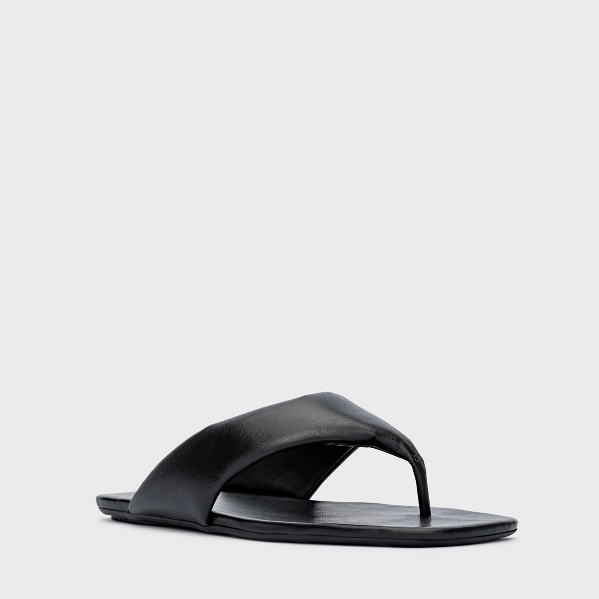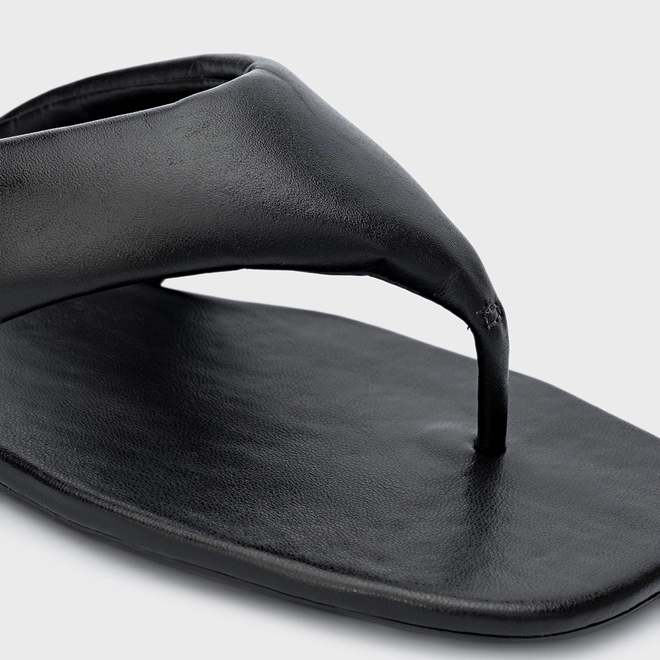 Flat thong de couro e bico quadrado. Traz tiras largas com espuma aplicada que é puro conforto, dividindo os dedos. Aberto, deixa todo pé à mostra.