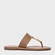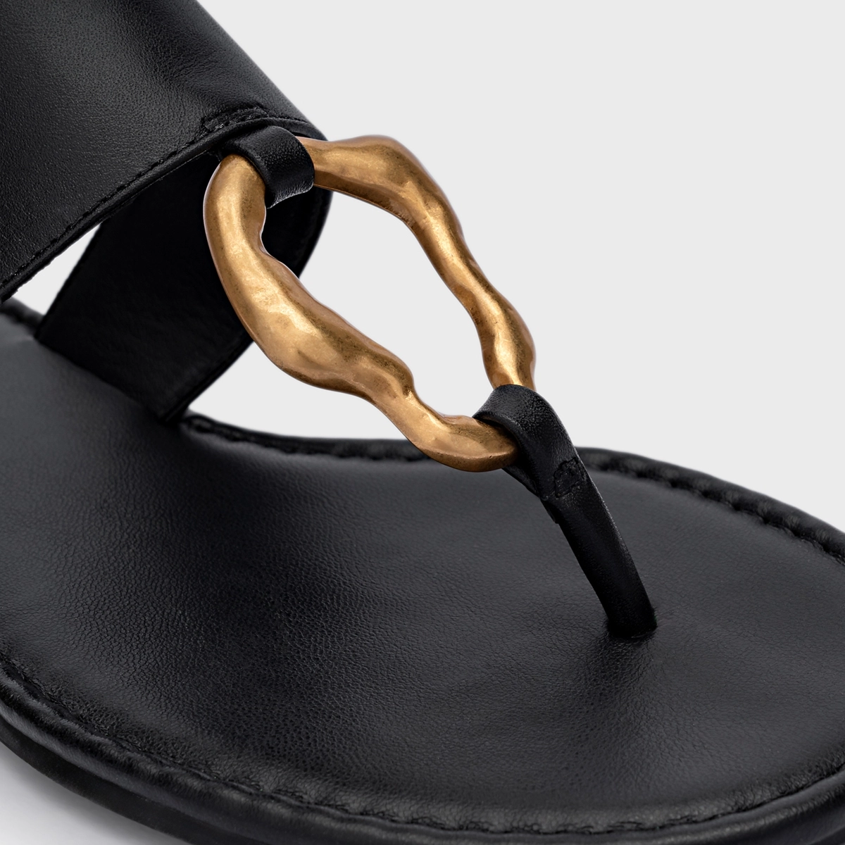 Flat thong em couro com bico arredondado e salto rasteiro. Modelo aberto com tiras que dividem os dedos e ornamento metálico dourado no cabedal.