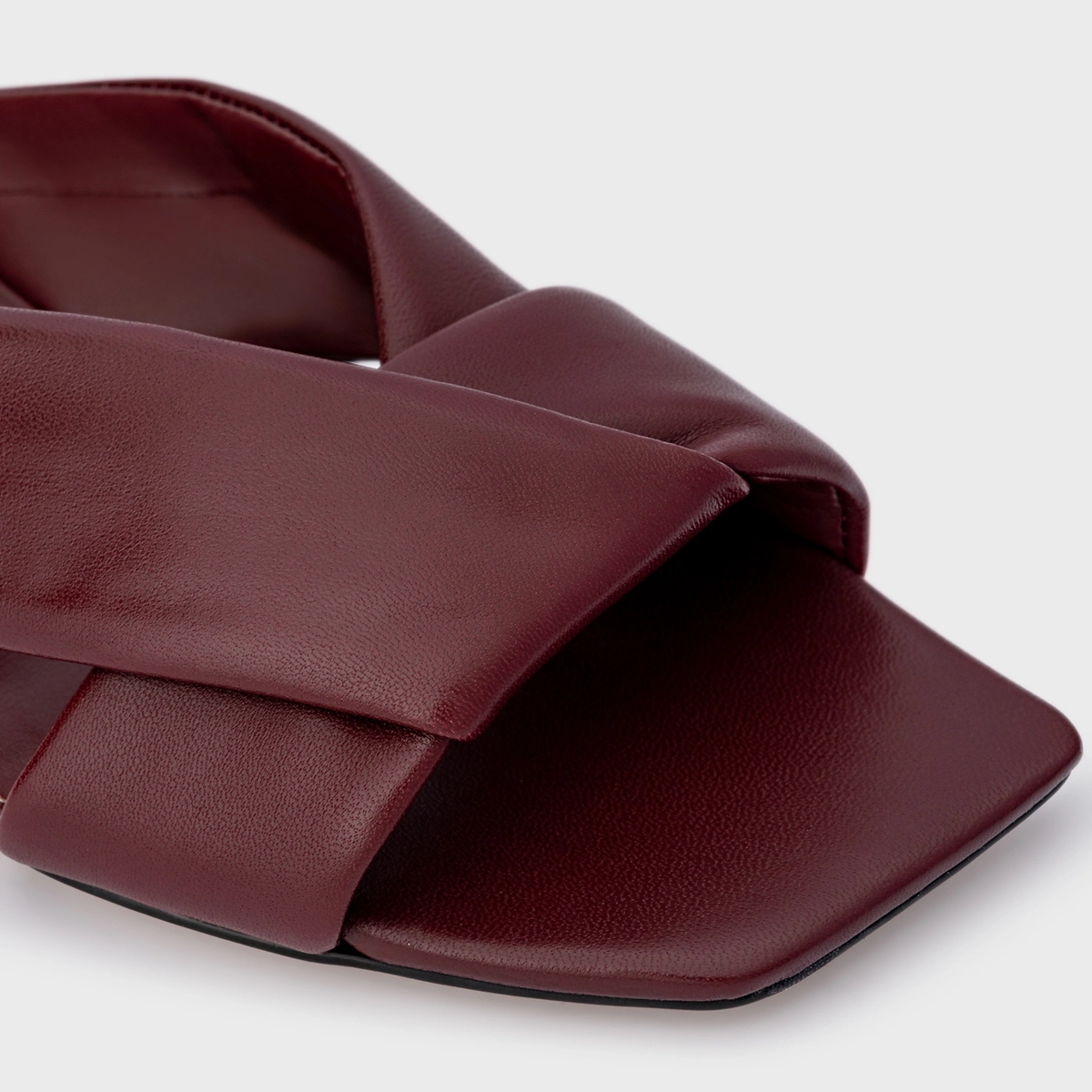 Flat em couro de bico quadrado. Traz tiras acolchoadas cruzadas com efeito nó sobre os dedos. Aberto, deixa todo pé à mostra.