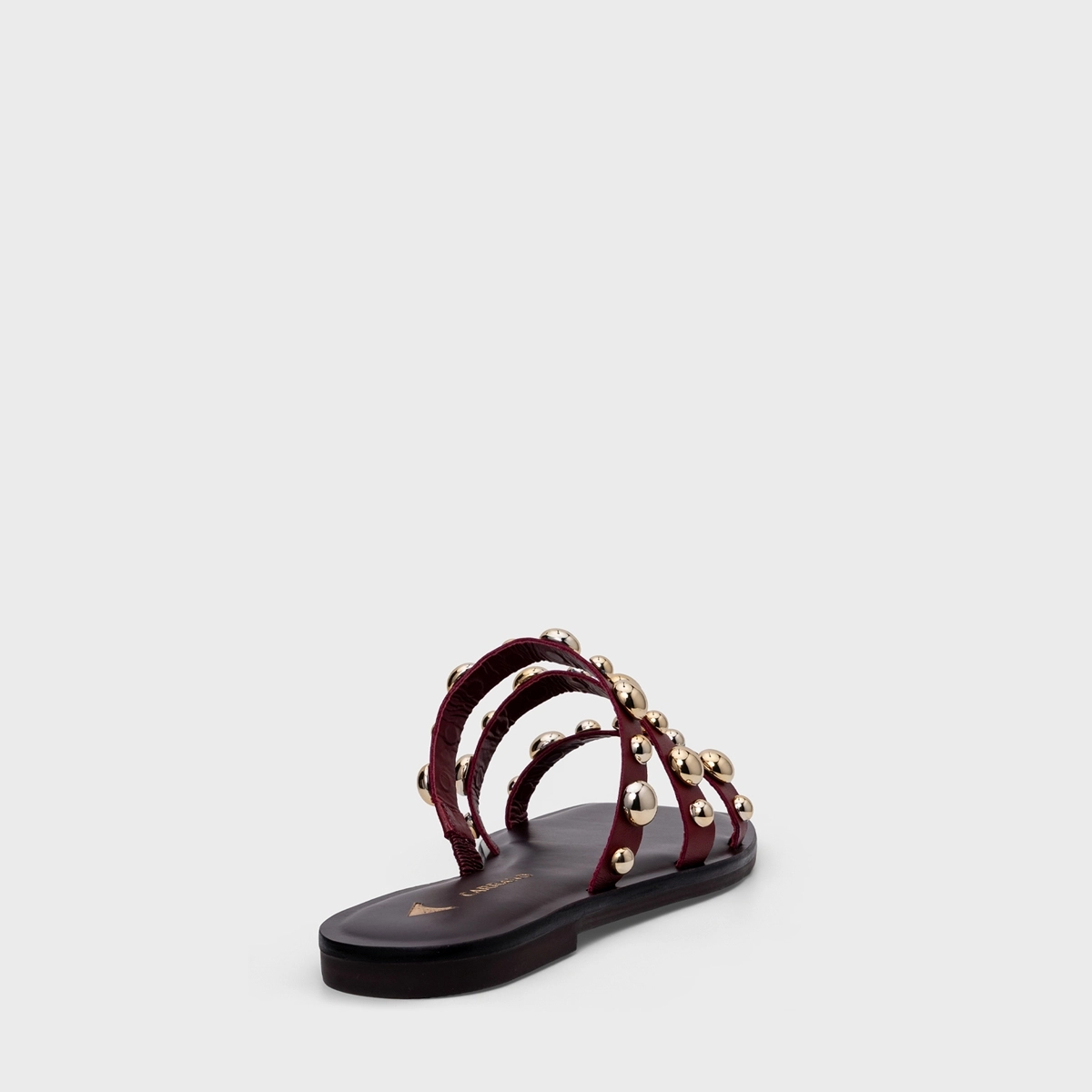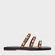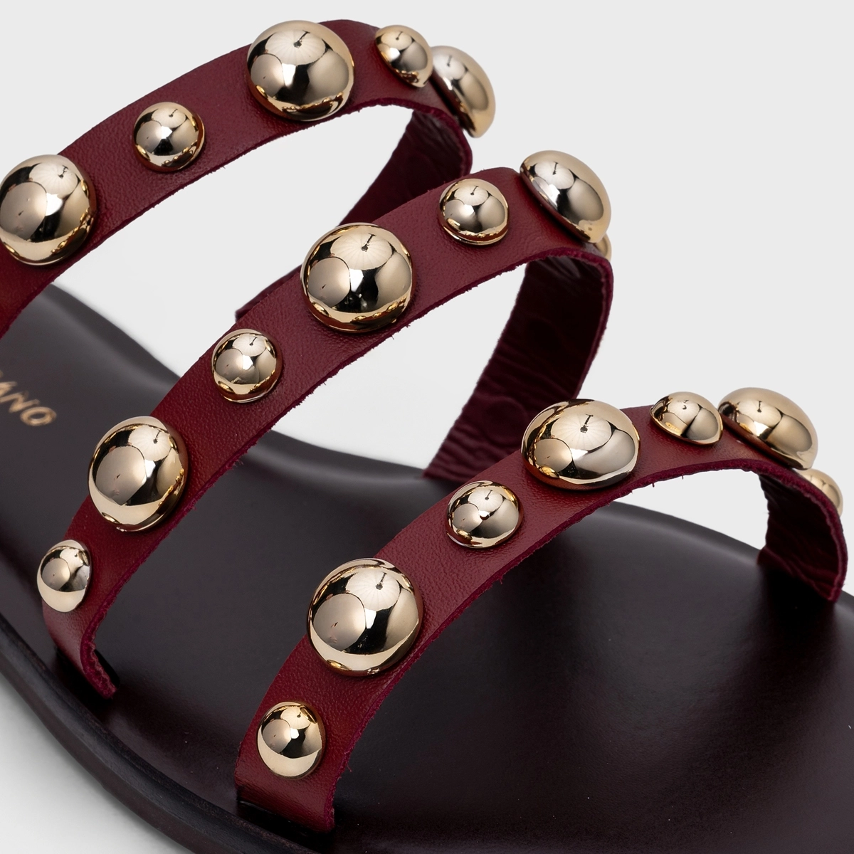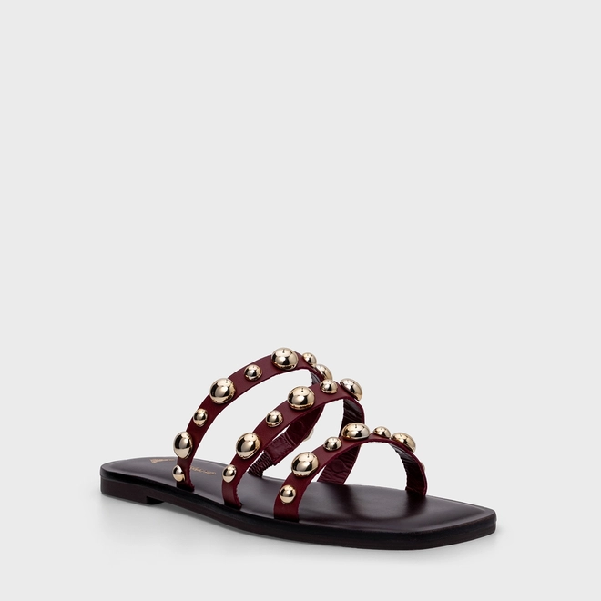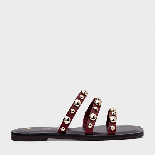 Flat de couro com salto rasteiro e bico quadrado. Modelo conta com três tiras sobre o pé, todas com adornos dourados.