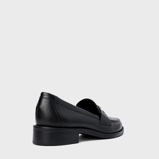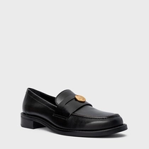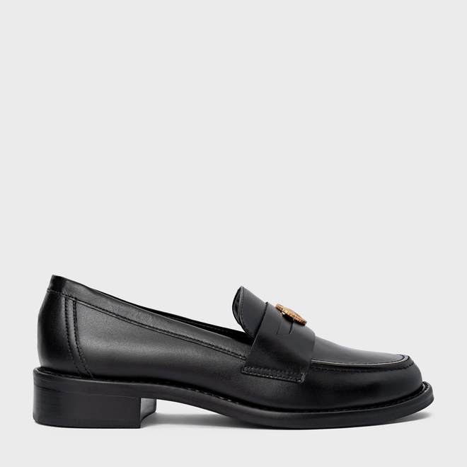 Loafer em couro. Possui salto bloco e bico arredondado. Apresenta recorte lateral na gáspea, além de detalhe frontal estilo gravata com a aplicação de adorno arredondado em metal.
