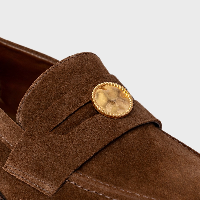 Loafer em couro suede. Possui salto bloco e bico arredondado. Apresenta recorte lateral na gáspea, além de detalhe frontal estilo gravata com a aplicação de adorno arredondado em metal.