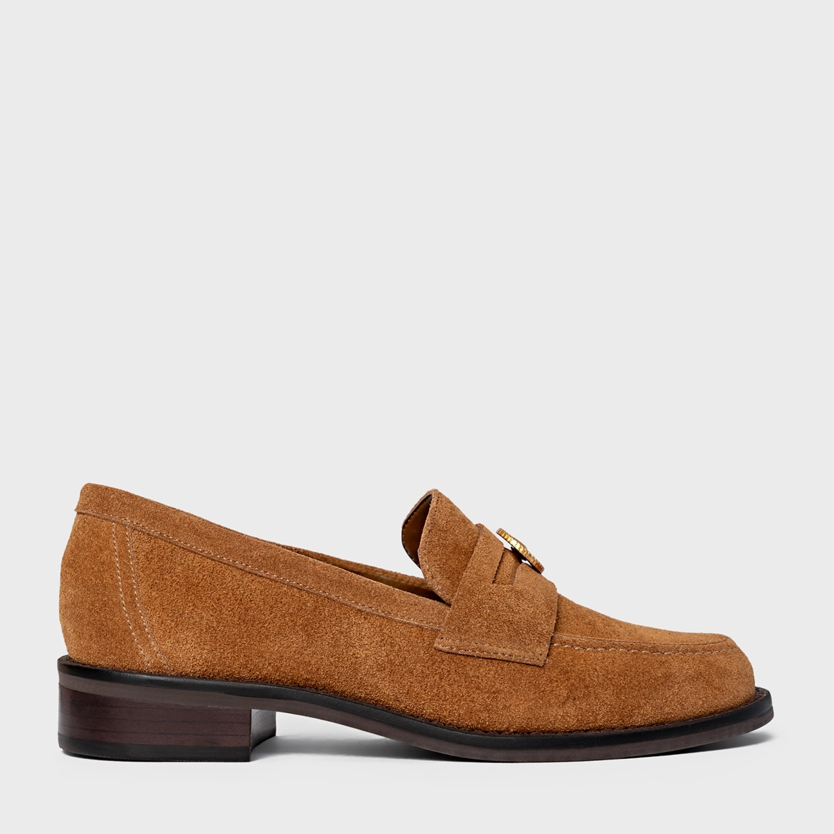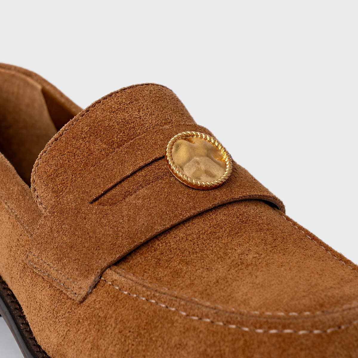Loafer em couro suede. Possui salto bloco e bico arredondado. Apresenta recorte lateral na gáspea, além de detalhe frontal estilo gravata com a aplicação de adorno arredondado em metal.