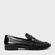 Loafer em couro verniz com salto bloco baixo e bico arredondado. Recorte lateral na gáspea e detalhe drapeado no couro em toda a lateral, além de detalhe frontal estilo gravata com aplicação do ícone.