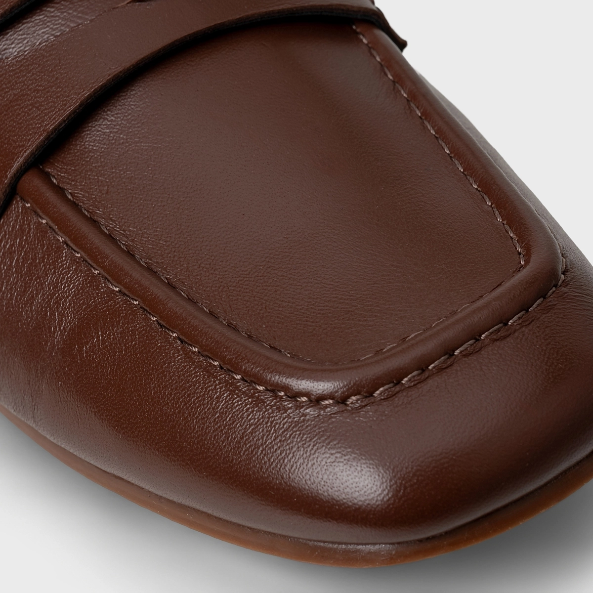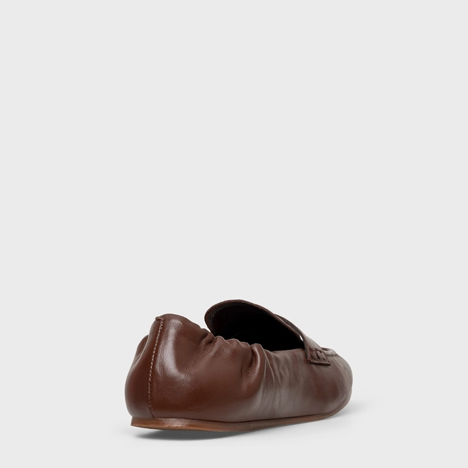 Mocassim de couro estilo loafer com salto bloco baixo e bico arredondado. Modelo fechado, com detalhe frontal tipo gravata, recorte lateral na gáspea e elástico traseiro para facilitar o calce.