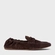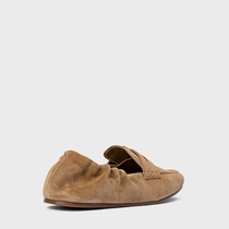 Loafer em couro suede, com salto rasteiro e bico arredondado. Apresenta detalhe frontal estilo gravata, ícone Carrano na lingueta e parte traseira maleável para facilitar o calce.
