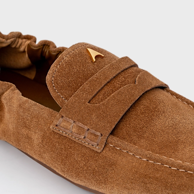Loafer em couro suede, com salto rasteiro e bico arredondado. Apresenta detalhe frontal estilo gravata, ícone Carrano na lingueta e parte traseira maleável para facilitar o calce.