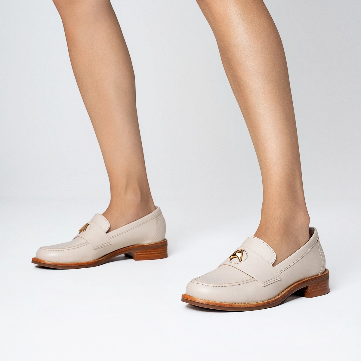 Mocassim de couro estilo loafer com salto bloco baixo e bico arredondado. Fechado, traz recorte lateral na gáspea, detalhe frontal estilo gravata com ícone centralizado.